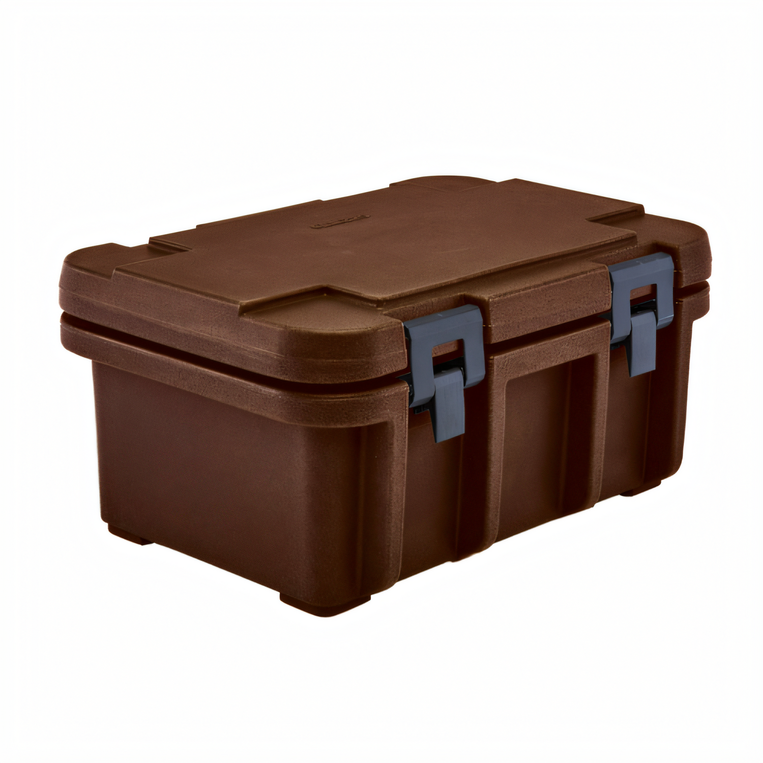 Ultra Pan Carriers®, top loading, holds (1) GN full size or fractional pans up to 8" deep, approximate capacity 24-1/2 qt., retention: hot for up to 4 hours (190° - 179° F) & cold for up to 4 hours (33.9° - 35.8° F), (4) E-Z grip molded-in handles, (4) nylon over-center latches, removable gasket, self venting design, stackable with Camcarrier®, dishwasher safe, scratch resistant textured exterior, one-piece seamless, double wall, polyurethane foam insulation, polyethylene construction, dark brown, NSF, Made in USA