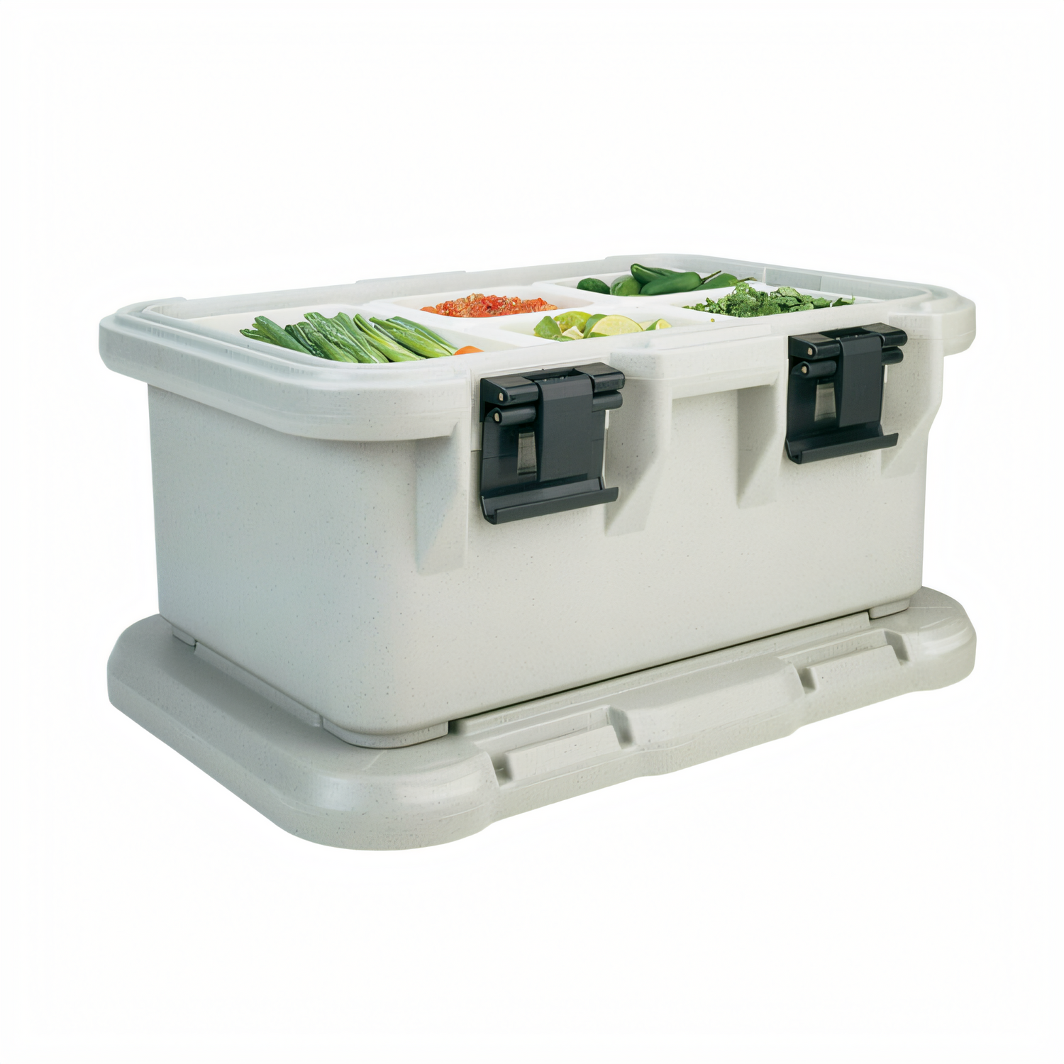 S-Series Ultra Pan Carriers®, top loading, holds (1) GN full size or fractional pans up to 8" deep, approximate capacity 24-1/2 qt., retention: hot for up to 4 hours (190° - 179° F) & cold for up to 4 hours (33.9° - 35.8° F), (4) EZ grip molded-in handles, (4) nylon latches, built-in gasket, self venting design, stackable with MPC Camcarriers and UPC Ultra Pan Carriers, dishwasher safe, polyurethane foam insulation, polypropylene construction, speckled gray, NSF, Made in USA