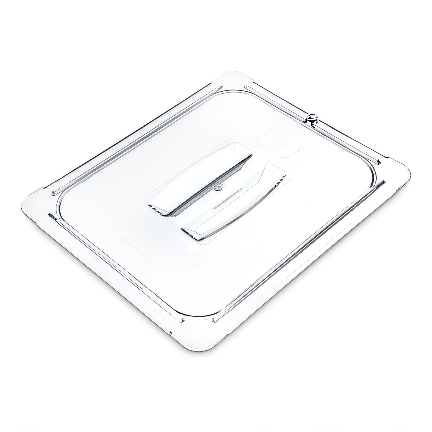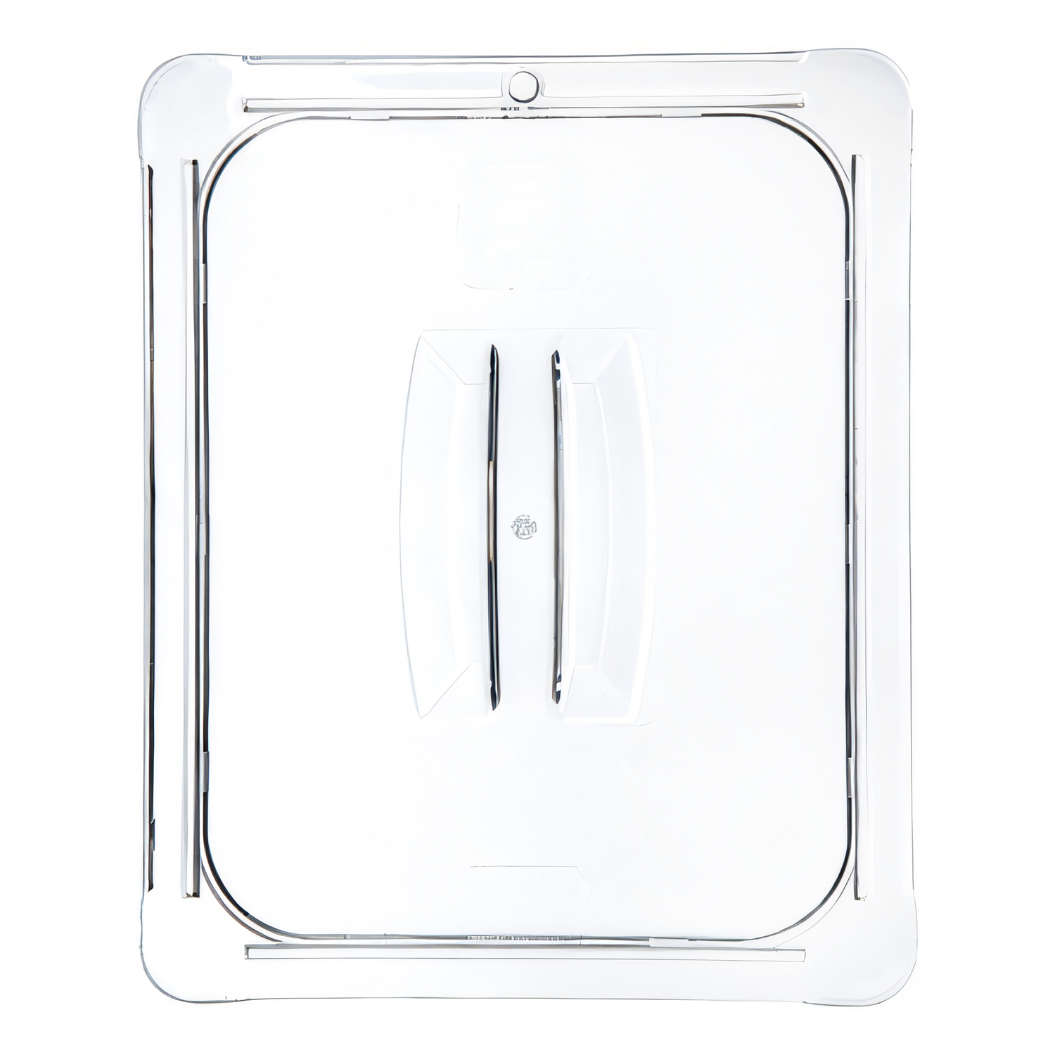 Clear polycarbonate 1/2‑size StorPlus™ lid with handle, stackable, non-slip, dishwasher safe, -40° to 212°F, NSF, made in USA.