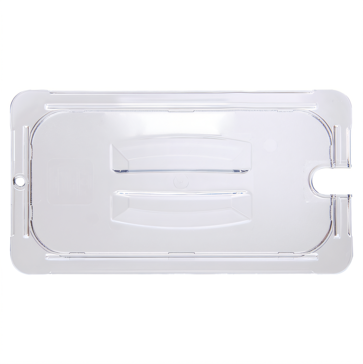 Durable clear polycarbonate lid for 1/3-size pans; handled, stackable, dishwasher-safe, temperature-safe -40° to 212°F, NSF, USA-made.