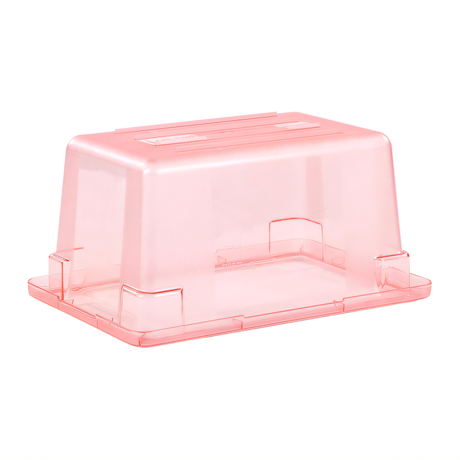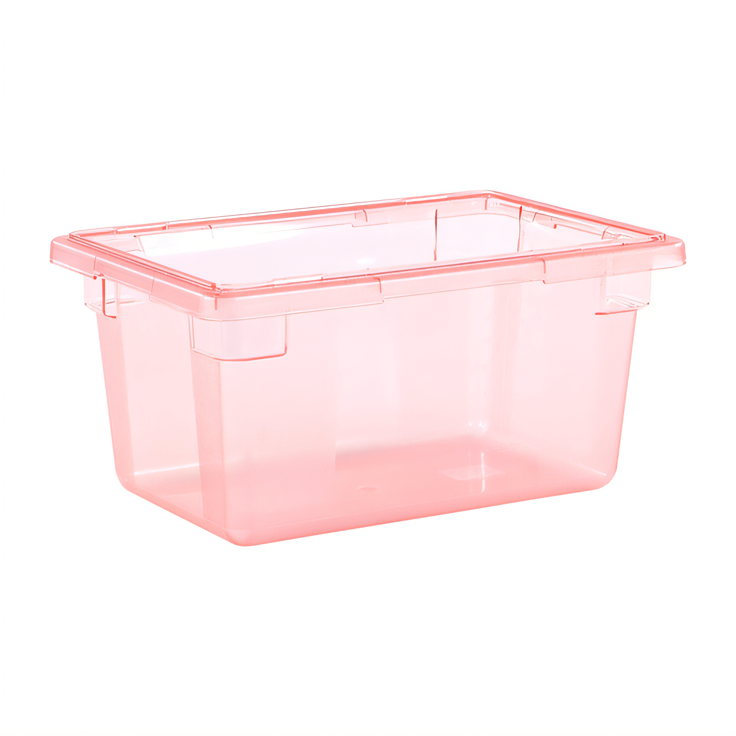 5-gal StorPlus™ food storage: clear red, stackable, reinforced corners, date/capacity marks, easy-grip handles, break-resistant, NSF.