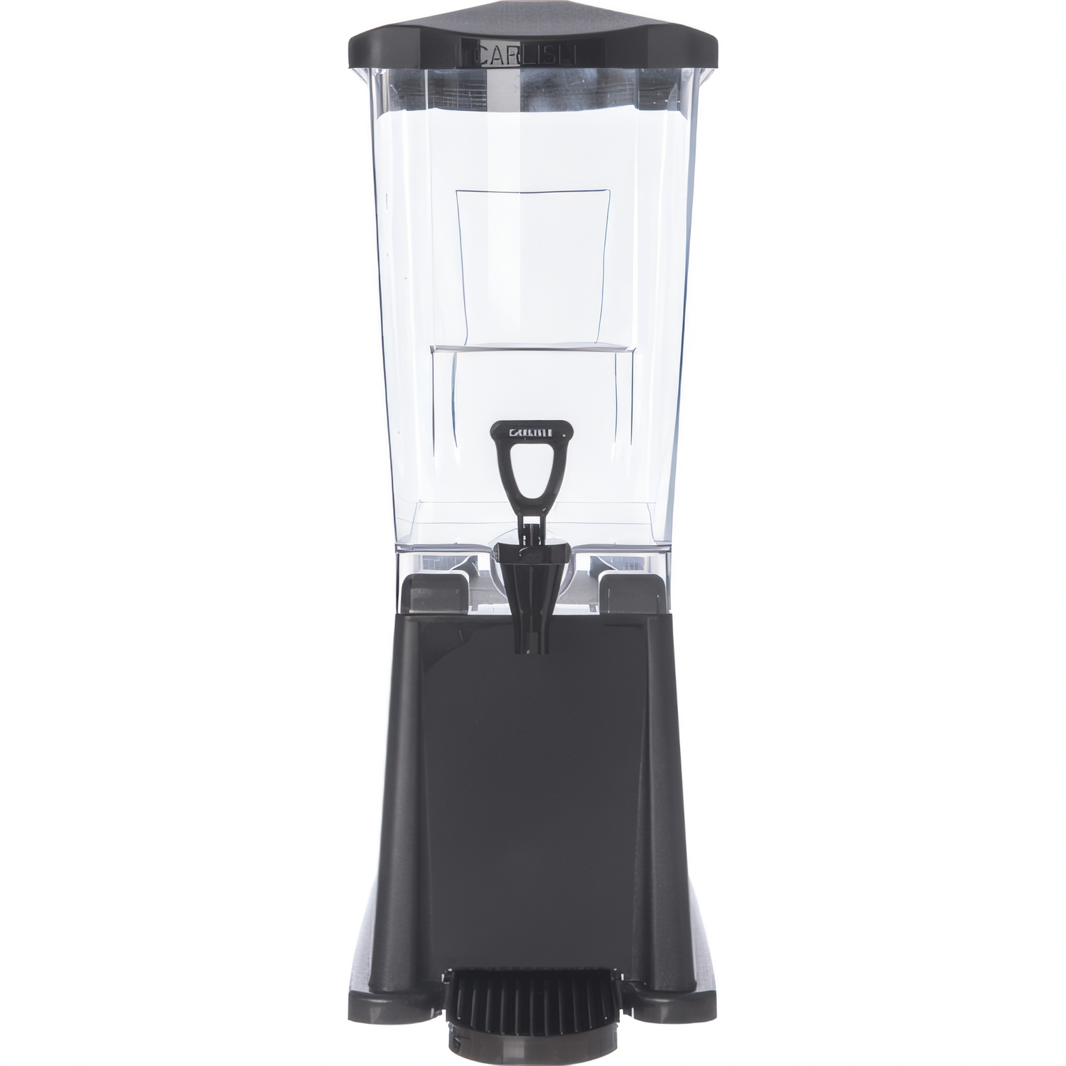 Carlisle - Trimline™ Premium Beverage Server, 3 gallon, 21-1/2"H x 8"W x 16-3/8" deep, rectangular, single bowl/base, capacity side indicators, ergonomic handles, removable drip tray, hingless lid, no-drip locking faucet, textured lid and base, dishwasher safe, includes labels: fruit punch, iced tea, lemonade, sweetened & unsweetened tea, clear polycarbonate, black, NSF, Made in USA
