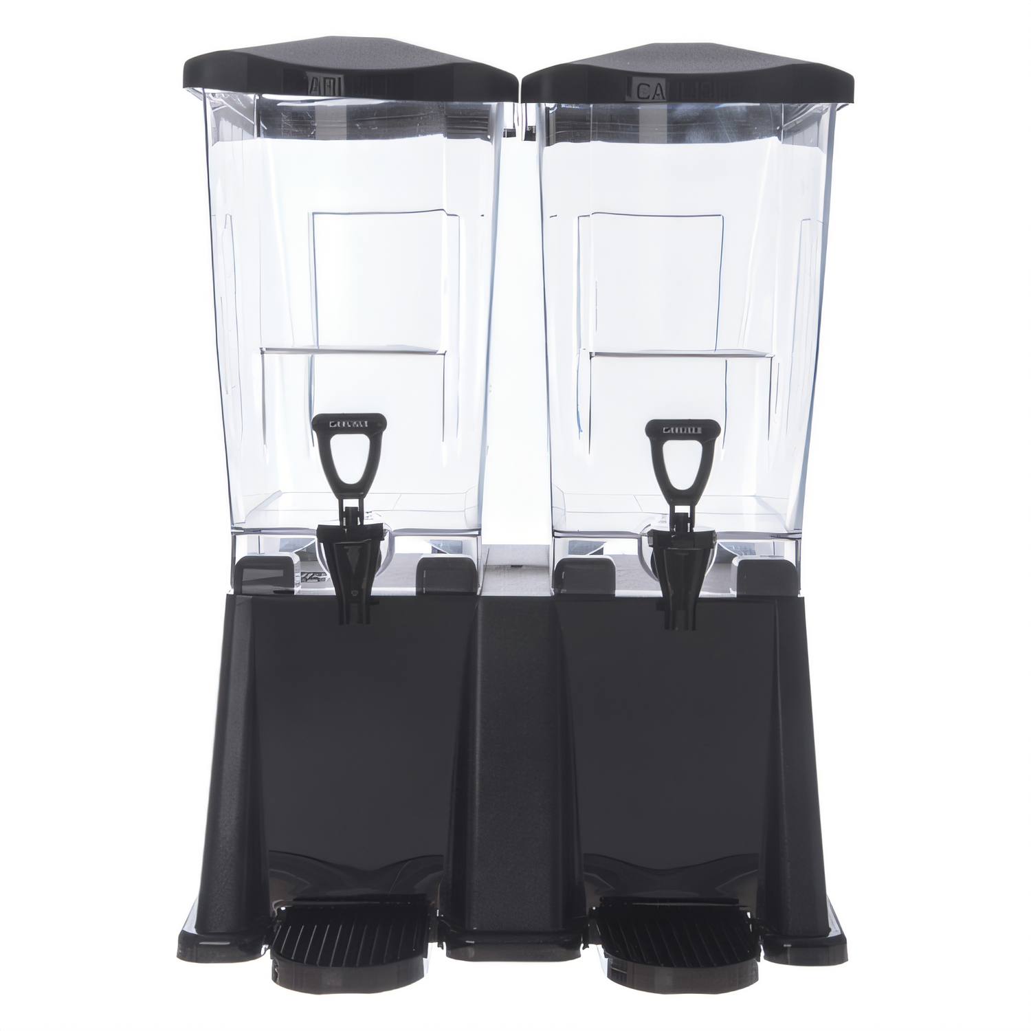 Carlisle - Trimline™ Premium Beverage Server, 6 gallon (3 gallon per bowl), 21-1/2"H x 15-3/4"W x 16-3/8" deep, rectangular, double bowl/base, capacity side indicators, ergonomic handles, removable drip tray, hingless lid, no-drip locking faucet, textured lid and base, dishwasher safe, includes labels: fruit punch, iced tea, lemonade, sweetened & unsweetened tea, recyclable, clear, polycarbonate, black, NSF, Made in USA