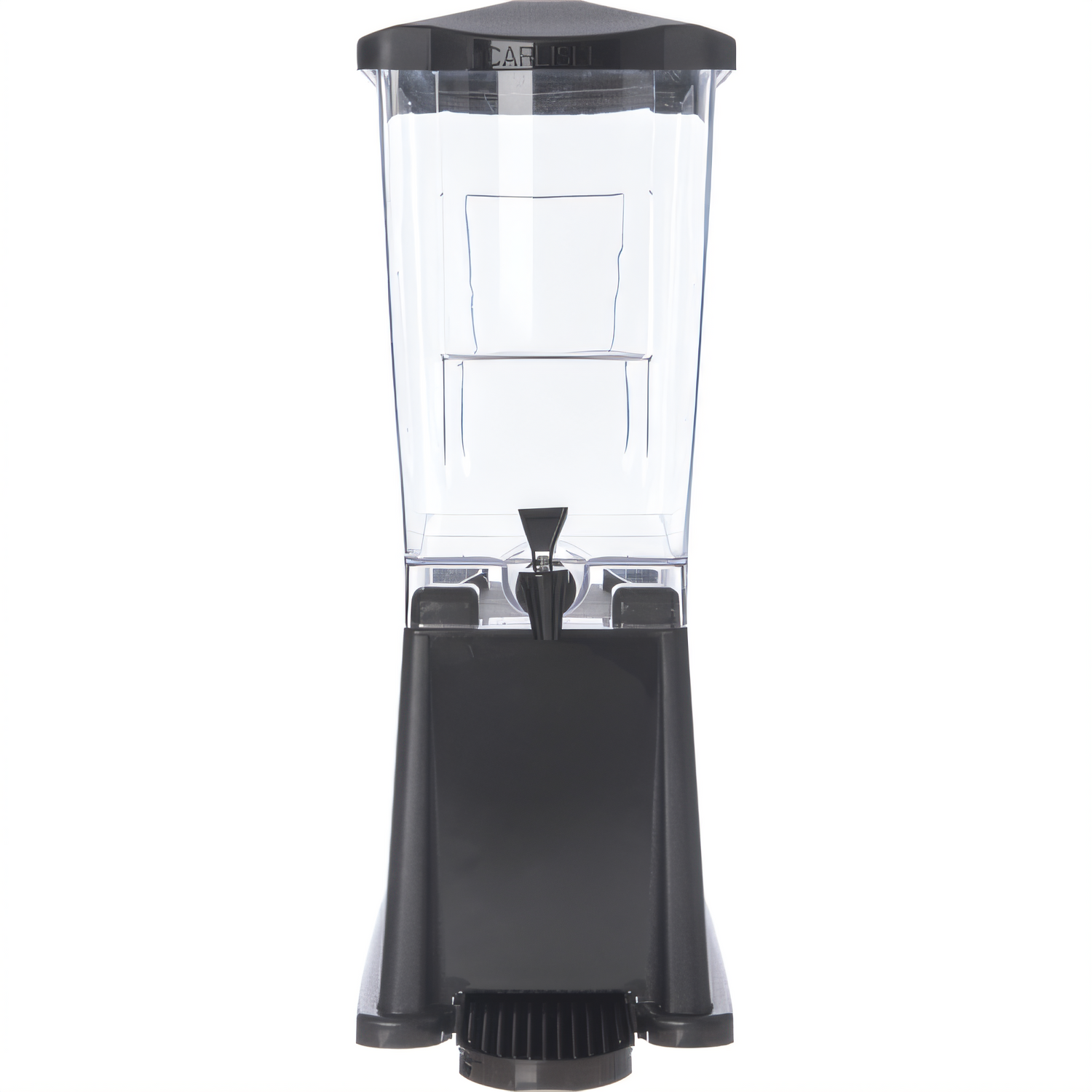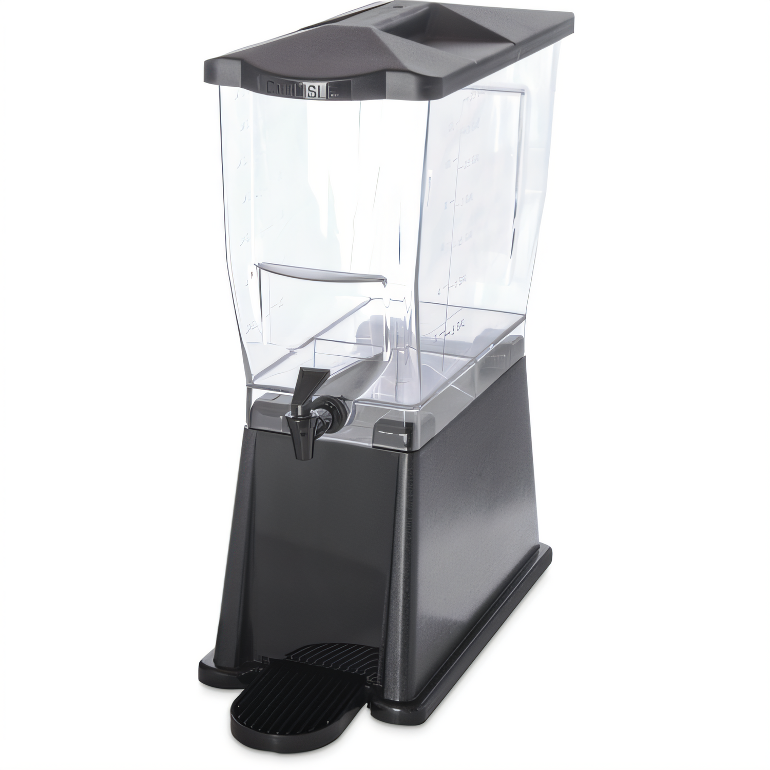 Carlisle - Trimline™ Economy Beverage Server, 3 gallon, 21-1/2"H x 8"W x 16-3/8" deep, rectangular, single bowl/base, capacity side indicators, ergonomic handles, removable drip tray, hingless lid, no-drip faucet, textured lid and base, dishwasher safe, includes labels: fruit punch, iced tea, lemonade, sweetened & unsweetened tea, recyclable, clear, polycarbonate, black, NSF, Made in USA