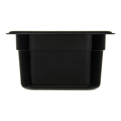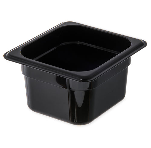Carlisle - StorPlus™ Food Pan, 1/6 size, 1.7 qt. capacity, 6-3/4" x 6-22/25" x 4" deep, capacity indicators, reinforced corners, textured non-slip finish, temperature range: -40° to 212° F, dishwasher safe, polycarbonate, black, NSF, Made in USA, meets EN631-1 Euro Norm standards