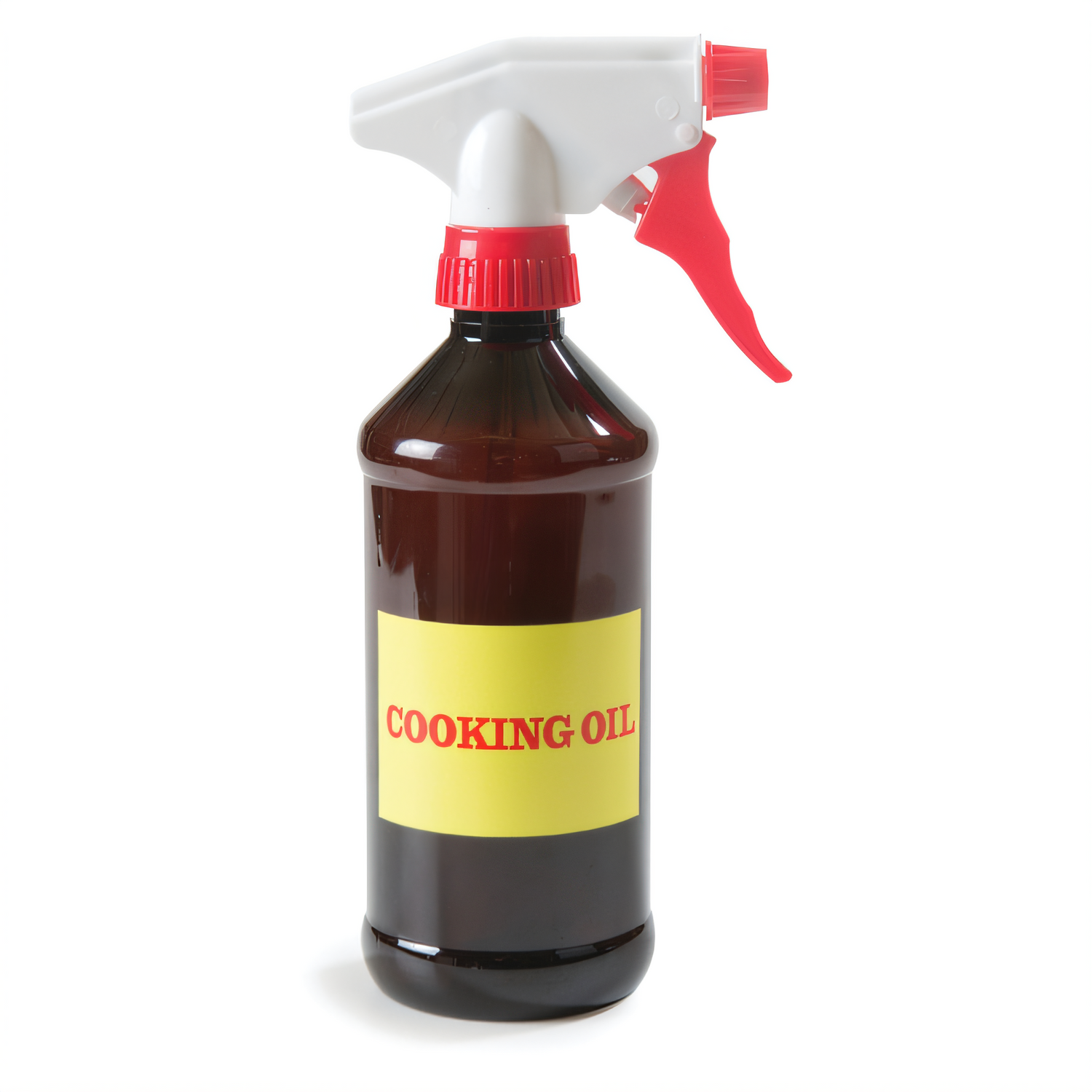 CFS Brands 16 oz amber oil bottle, pre-labeled plastic for easy dispensing and storage; sprayer sold separately.
