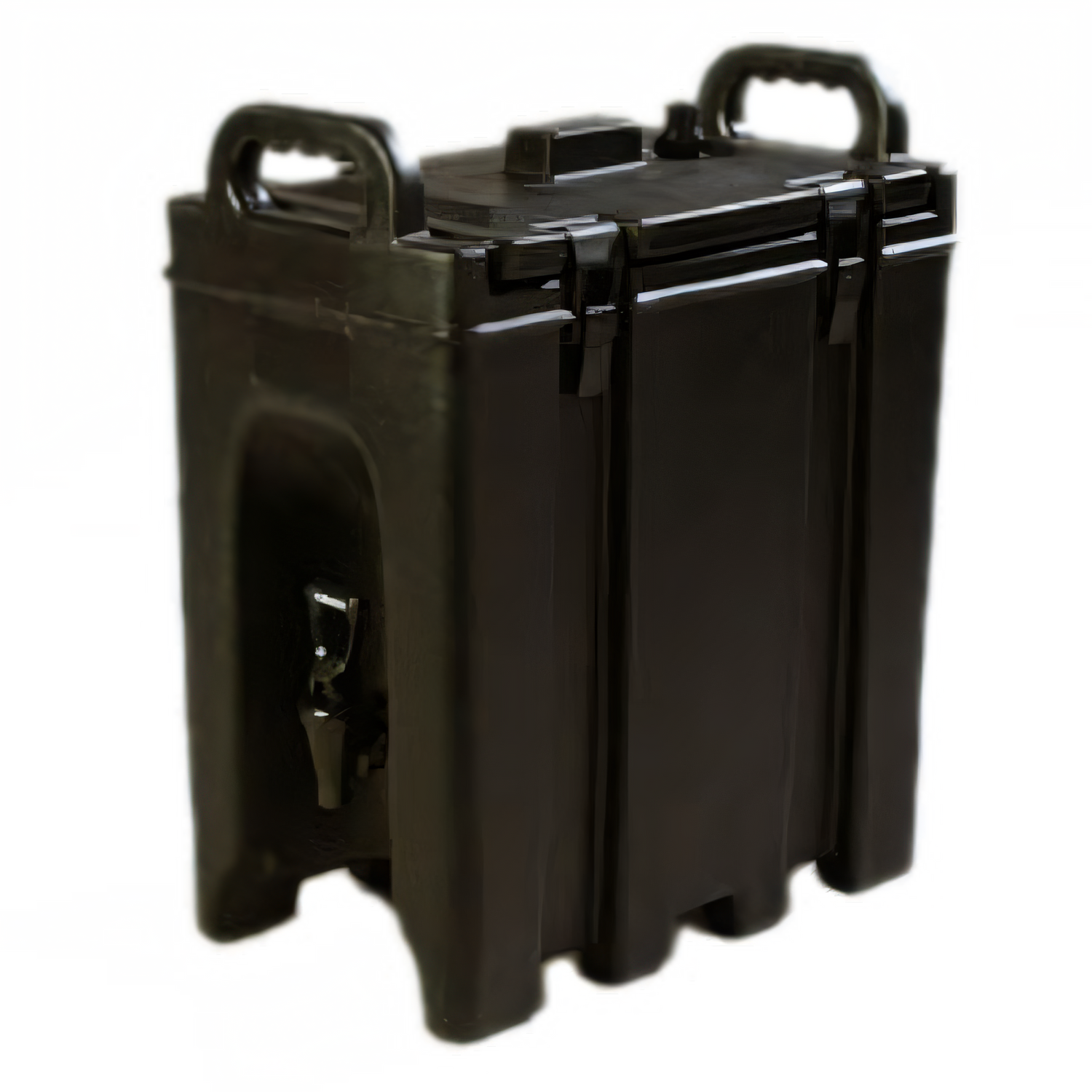 Carlisle - Cateraide™ LD Beverage Server, 2-1/2 gallon, insulated, Nylex II™ latches mounted into steel reinforced plates, convex lid, O-ring seal, spring action drip-less faucet, easy-grip formed handles, stain & scratch-resistant, stackable, polyethylene, black, NSF, Made in USA