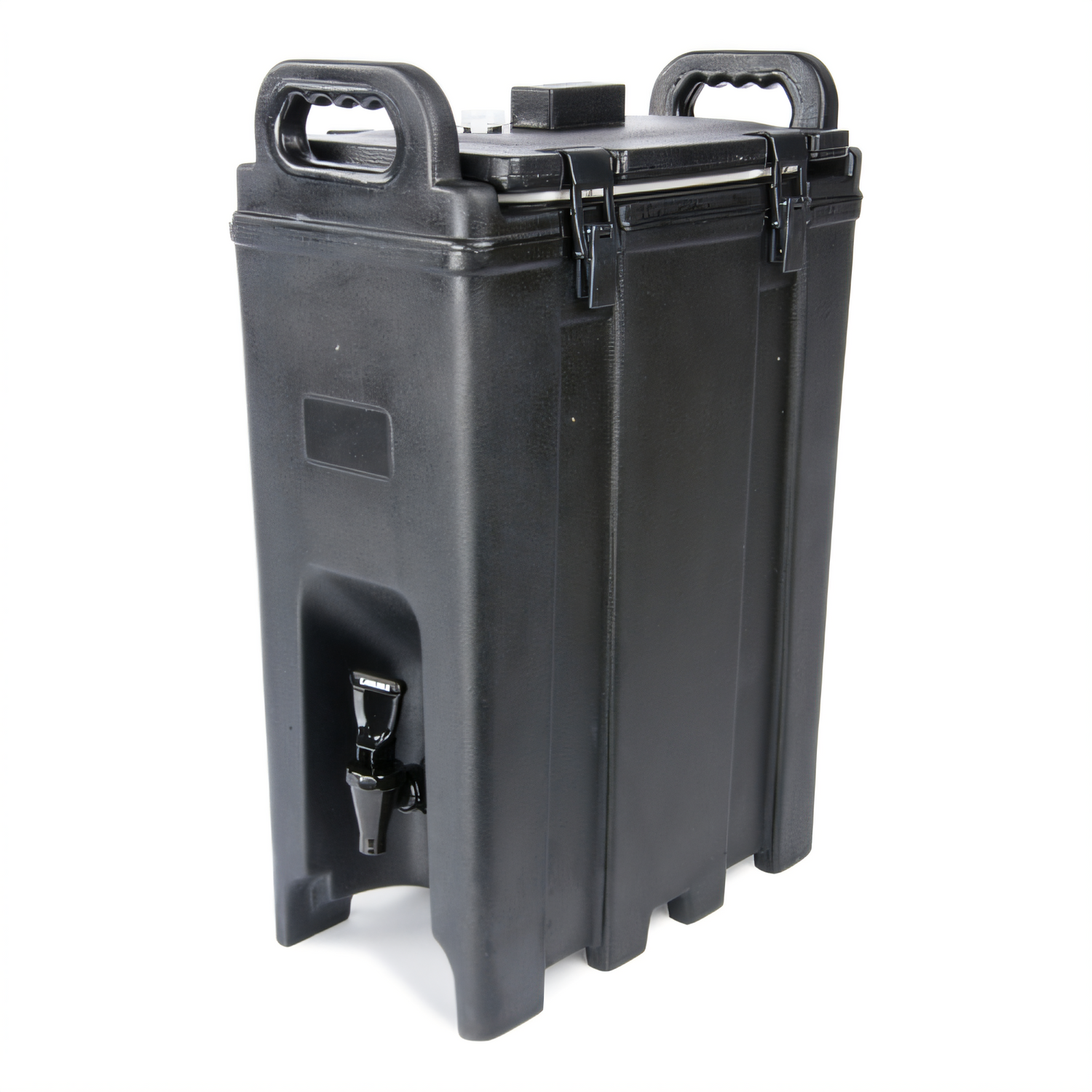 Carlisle - Cateraide™ LD Beverage Server, 5 gallon, insulated, Nylex II™ latches mounted into steel reinforced plates, convex lid, O-ring seal, spring action drip-less faucet, easy-grip formed handles, stain & scratch-resistant, stackable, polyethylene, black, NSF, Made in USA