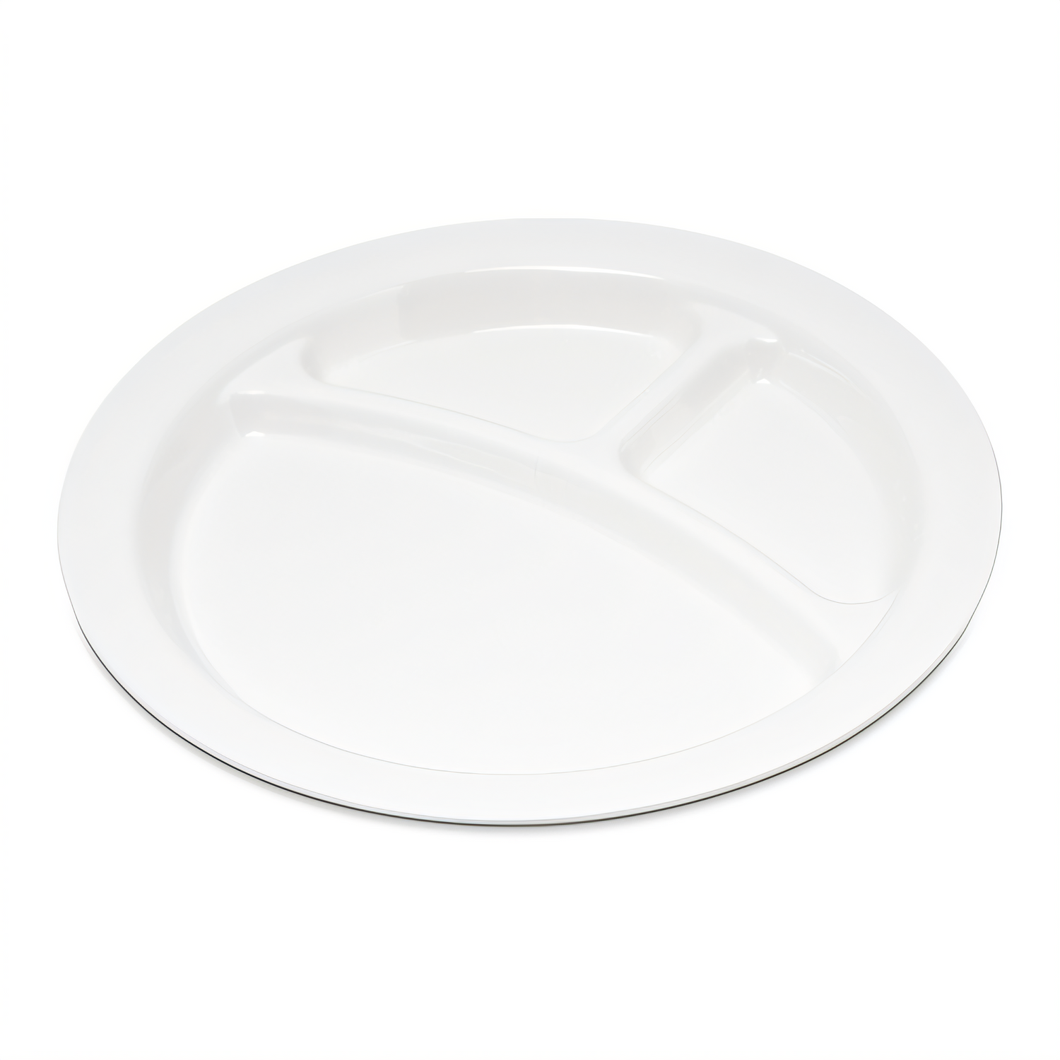 Durable 9" white 3-compartment polycarbonate plate — NSF, dishwasher-safe, stackable, temperature-resistant -40°F to 212°F.