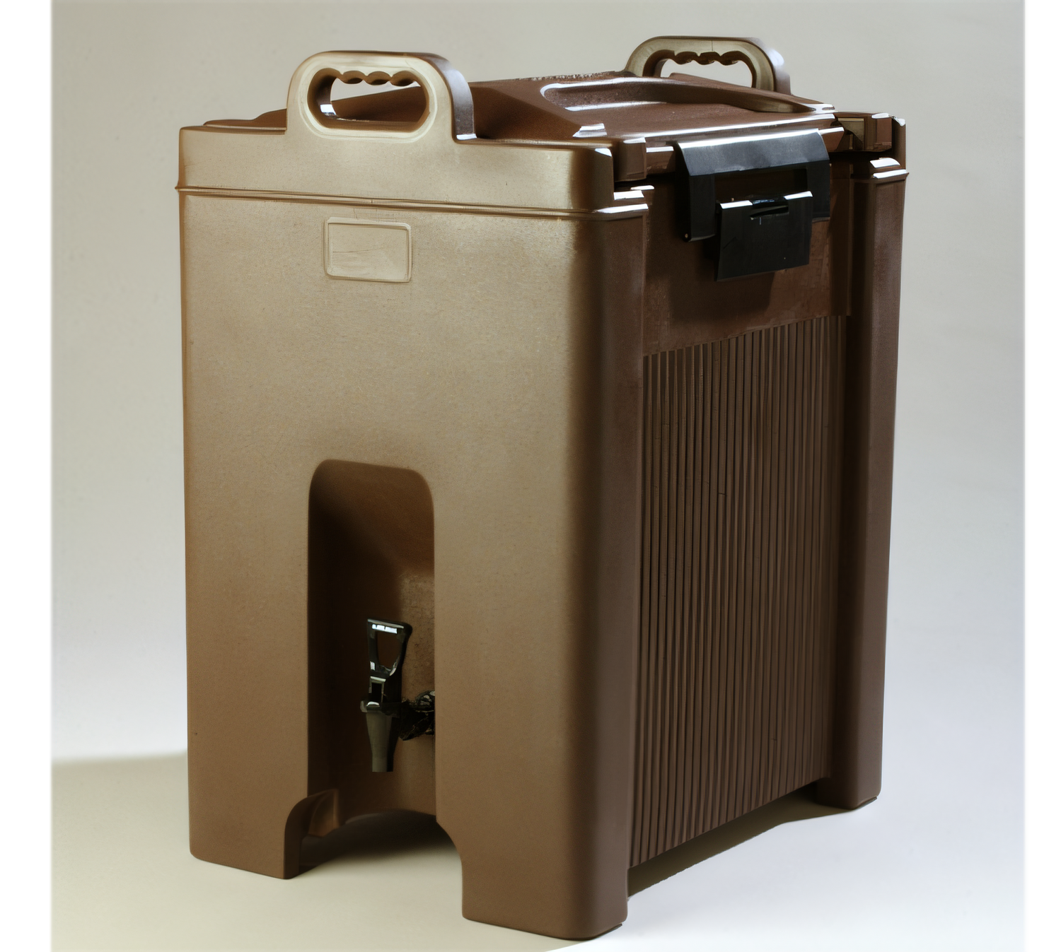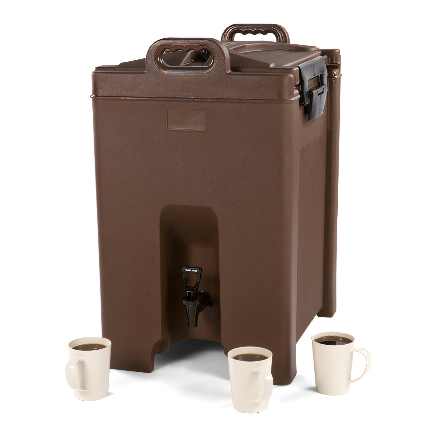 Carlisle - Cateraide™ XT Beverage Server, 10 gallon, insulated, Sure-Latch™ wide design, latch mounted into steel reinforced plates, convex lid with pop-up vent, O-ring seal, spring action drip-less faucet, easy-grip formed handles, stackable, polyethylene, brown, NSF, Made in USA