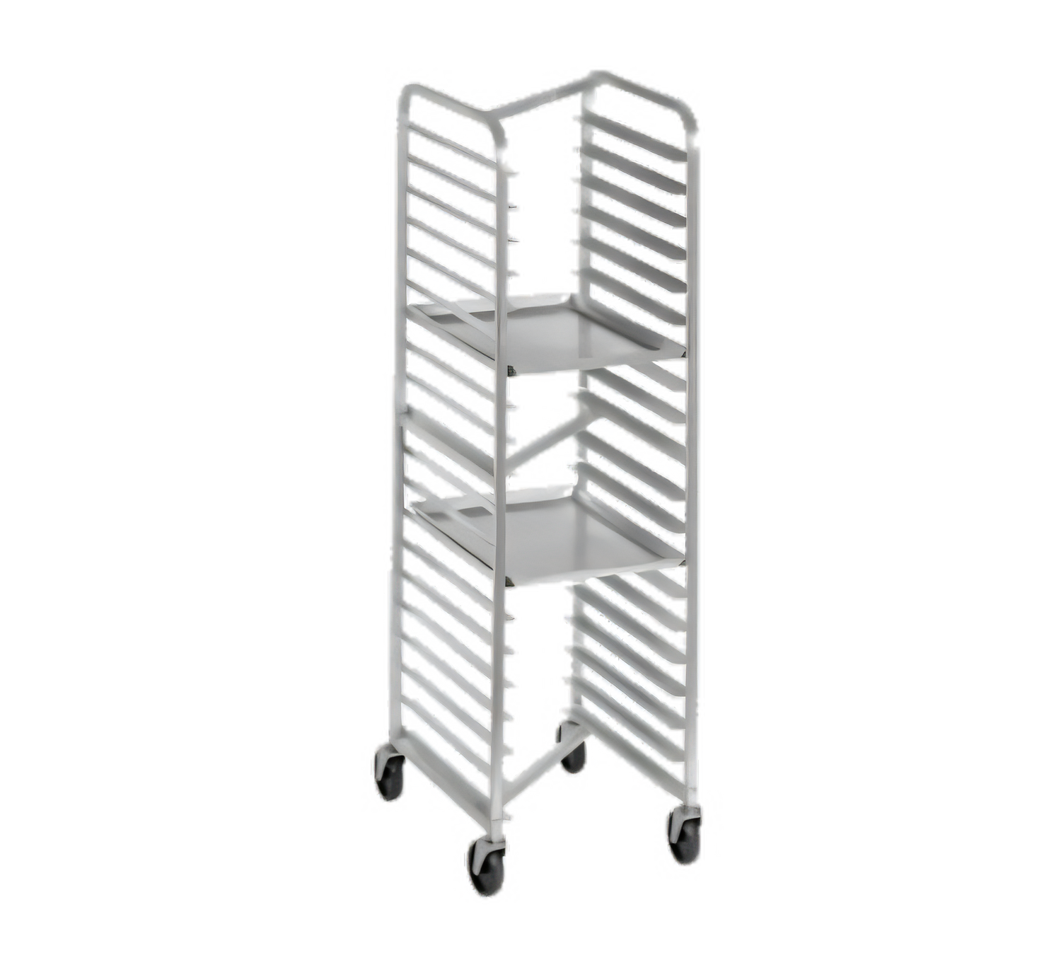 Bun Pan Rack, Nesting, Standard Heavy-Duty Series, 20.5"W x 26"D x 70.25"H, Aluminum Construction, End Load, 4" Angle Spacing, (15) 18" x 26" or (30) 13" x 18" pans (2 per shelf), 5" Swivel Stem Casters model # CSS45O, Made in USA, NSF, 31lbs. (ITEM WEIGHT ONLY), weight does not include 50 lbs. for pallet weight