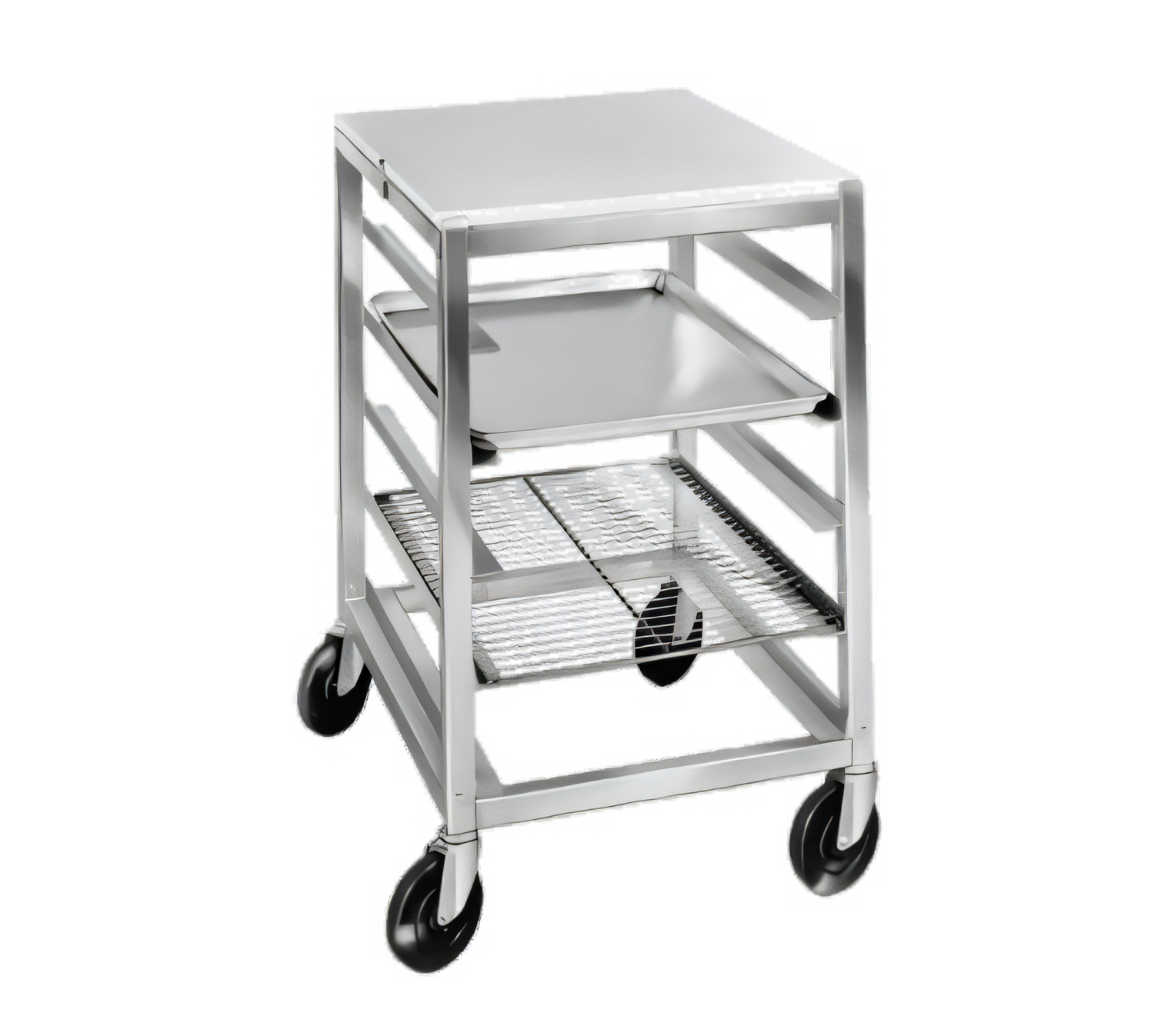 Channel Manufacturing BPRE-5/P bun pan rack: sturdy aluminum work table with poly top, angle slides, 5" casters, end-load, NSF,Made in USA.