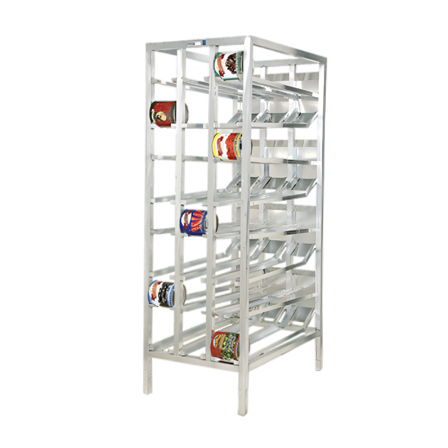 - Holds up to 156 #10 cans across inclined, easy-glide slides.