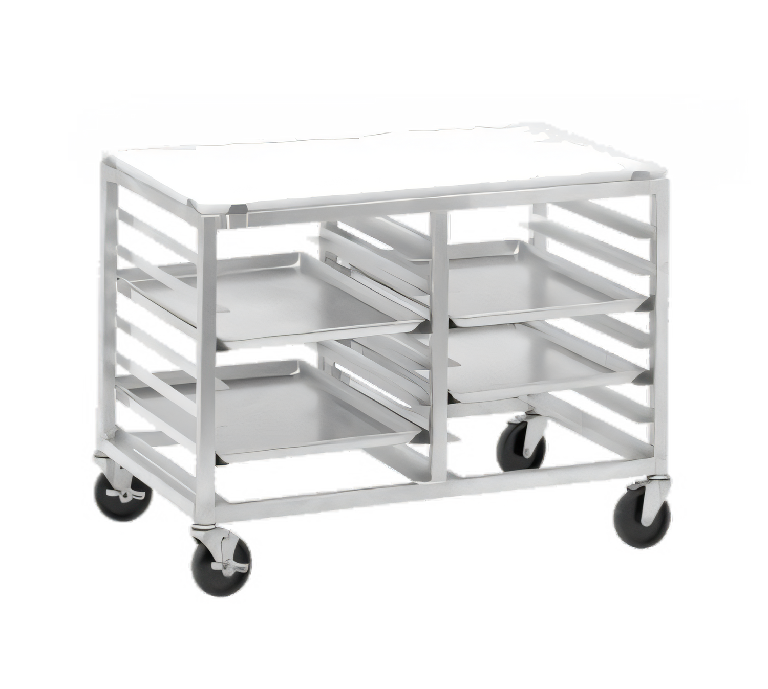 Bun Pan Rack, Work Table - Double Section, Angle Slides, 40"W x 24"D x 29-1/2"H, Aluminum Construction with Poly Top, End Load, 4" Angle Spacing, (10) 18" x 26" or (20) 13" x 18" pans (2 per shelf), 5" Swivel Stem Casters model # CSS45O, Made in USA, NSF, 59lbs. (ITEM WEIGHT ONLY), weight does not include 50 lbs. for pallet weight