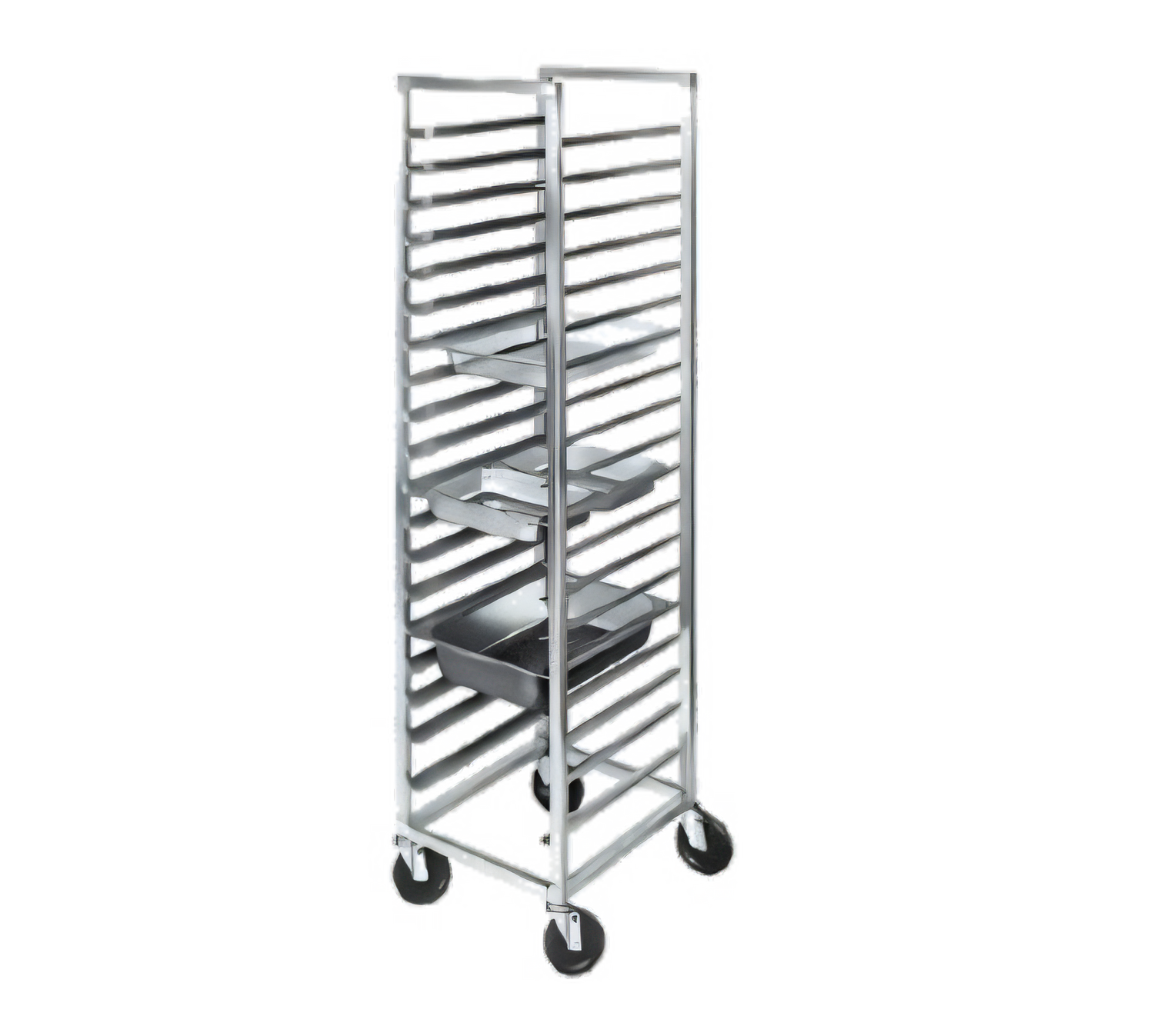 Steam Table Pan Rack, 12 X 20 Steam Table Pan Rack, Standard Series, 16.5"W x 22"D x 70.5"H, Aluminum Construction, End Load, 3" Angle Spacing, (19) 12" x 20" steam table pans (1 per shelf), 5" Swivel Stem Casters model # CSS45PU, Made in USA, NSF, 28lbs. (ITEM WEIGHT ONLY), weight does not include 50 lbs. for pallet weight