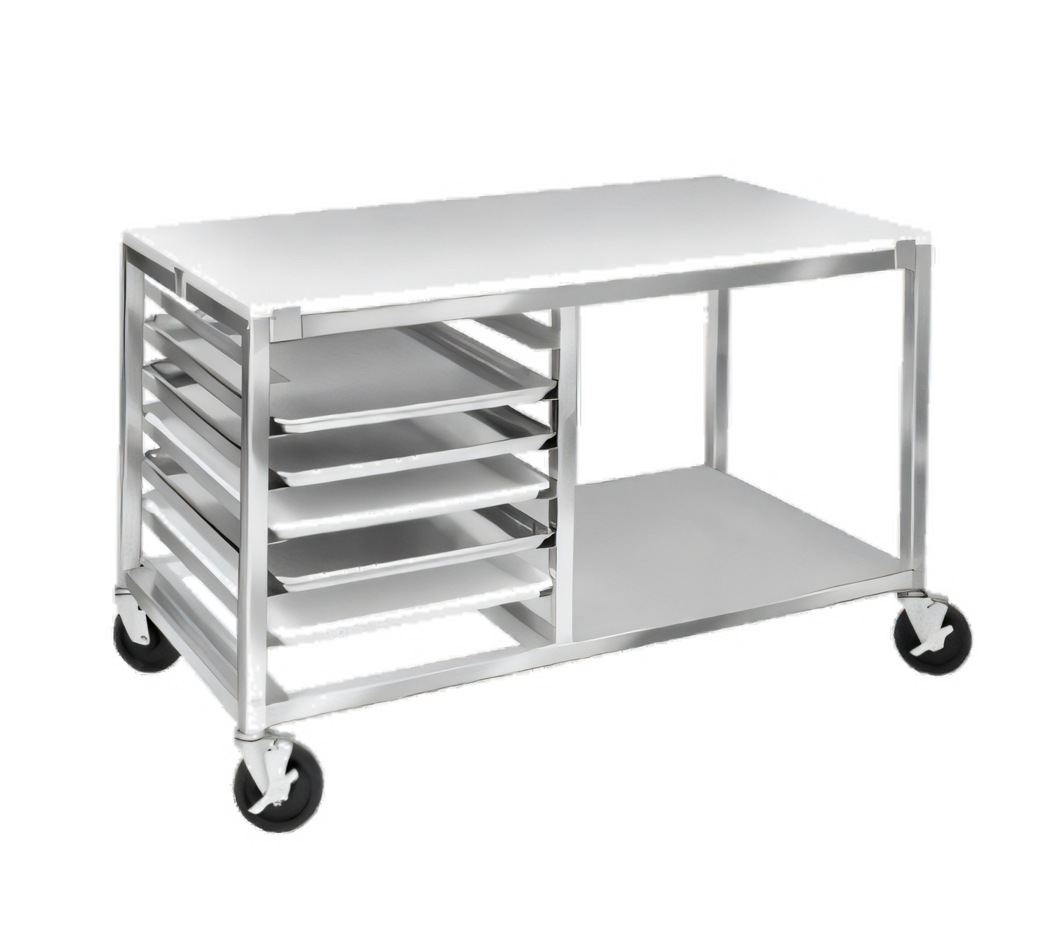 Bun Pan Rack, Work Table - Double Section, Angle Slides & Open Shelf, 48 "W x 24"D x 31.5"H, Aluminum Construction w/ Poly Top, End Load, 3" Angle Spacing, (7) 18" x 26" or (14) 13" x 18" pans (2 per shelf), 5" Swivel Stem Casters model # CSS45O, Made in USA, NSF, 64lbs. (ITEM WEIGHT ONLY), weight does not include 50 lbs. for pallet weight
