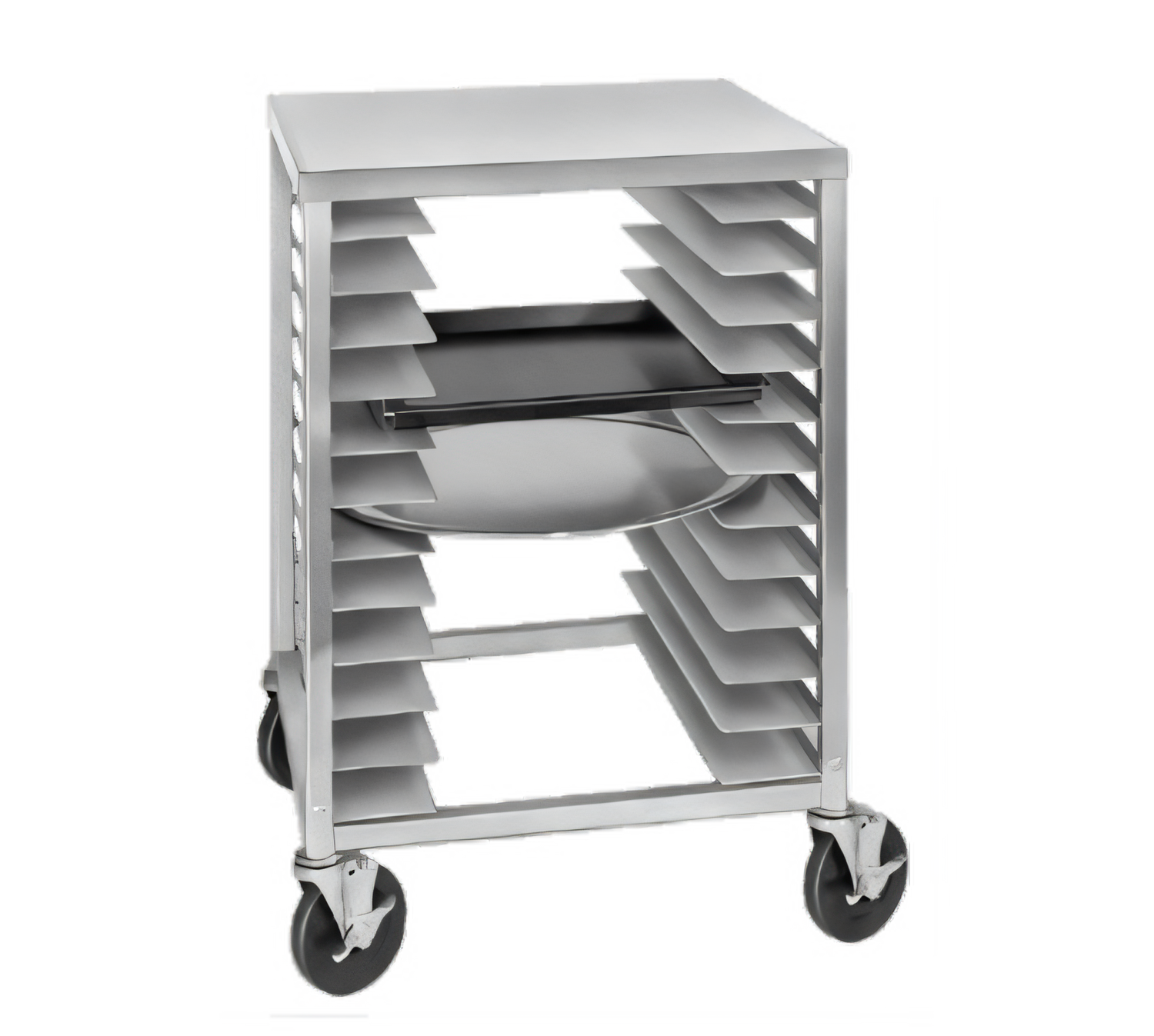 Pizza Equipment, Pizza Pan / Dough Box Rack, Pizza Pan 1/2 Size Rack – Aluminum Top, 22"W x 20"D x 32.5"H, Aluminum Construction, End Load, 2" Angle Spacing, (12) 17" to 19" round or 16" to 17" square pizza pans, 5" Swivel Stem Casters model # CSS45O, Made in USA, NSF, 37lbs. (ITEM WEIGHT ONLY), weight does not include 50 lbs. for pallet weight