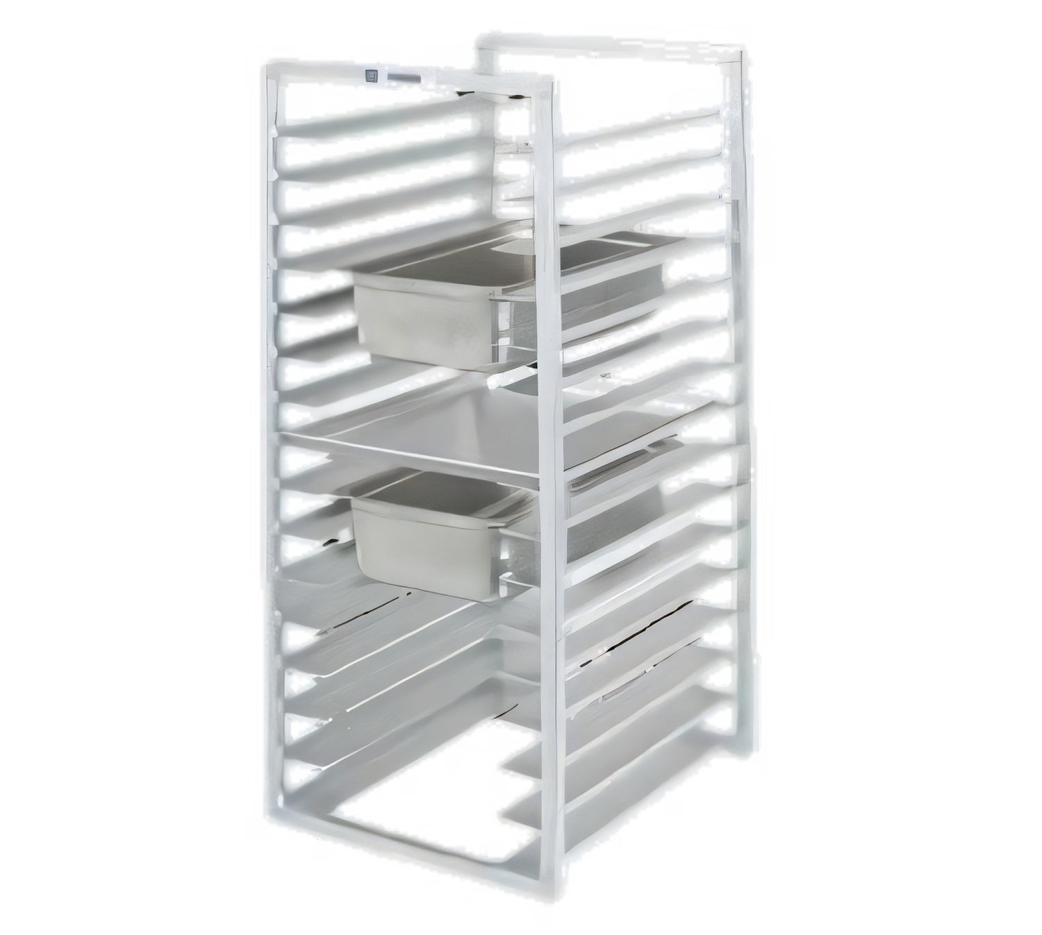 Bun Pan Rack, Reach-In Bun Pan / Steam Table Pan Rack, 20.5"W x 23"D x 51"H, Aluminum Construction, End Load, 5" Angle Spacing, (10) 18" x 26" or (20) 13" x 18" (2 per shelf) or 12" x 20" Steam Table Pans (pan height determines capacity), Made in USA, NSF, 38lbs. (ITEM WEIGHT ONLY), weight does not include 50 lbs. for pallet weight