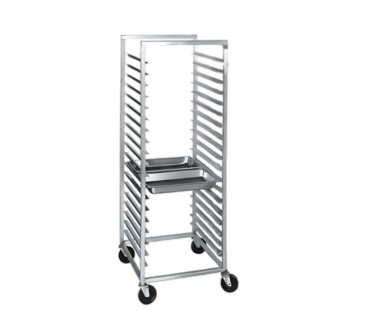 Steam Table Pan Rack, 12 X 20 Steam Table Pan Rack, Stainless Series, 24"W x 26"D x 64"H, Stainless Steel Construction, Side Load, 5" Angle Spacing, (22) 12" x 20" steam table pans (2 per shelf), 5" Swivel Stem Casters model # CSS45PU, Made in USA, NSF, 46lbs. (ITEM WEIGHT ONLY), weight does not include 50 lbs. for pallet weight