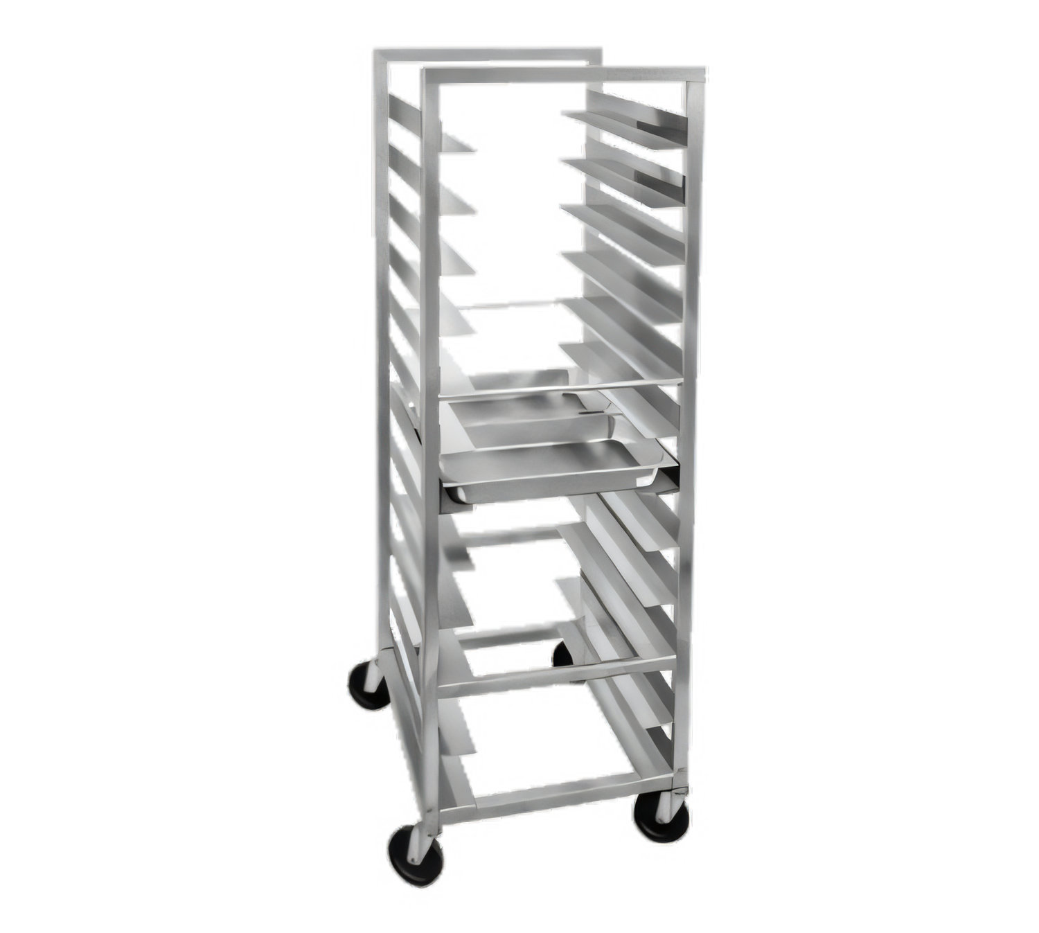 Channel Manufacturing STPR-83 Lifetime Tough Pan Racks - Extra heavy-duty 24"W x 26"D x 36"H aluminum steam table pan rack with end-load design and extra-wide 3" heavy-duty pan slides. Holds (8) 12" x 20" pans (2 per shelf) on 8" angle spacing, 5" swivel stem casters (model CSS45O), NSF certified and made in USA. Durable 36" height, 24 lb item weight — ideal for commercial kitchens and catering operations.