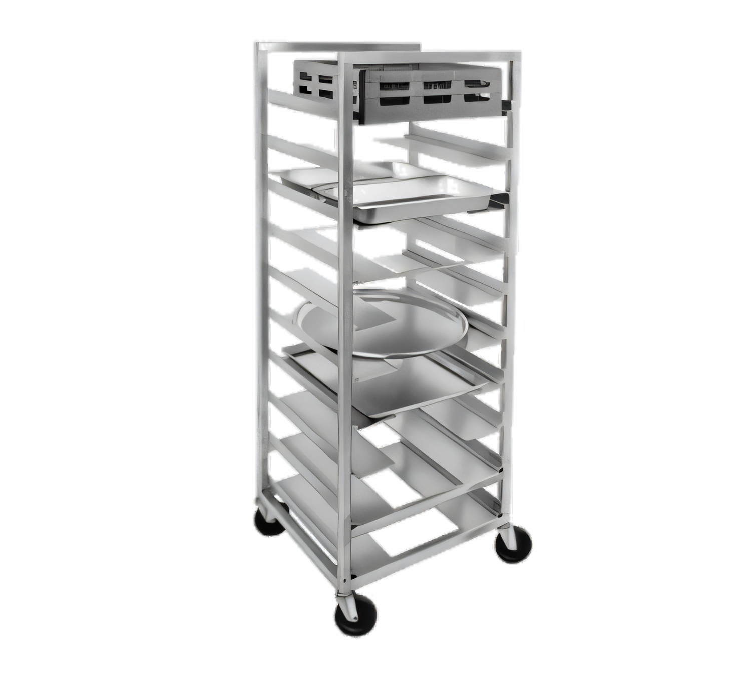 Universal Rack, All-Welded Universal Rack, 25.5"W x 26"D x 31"H, Aluminum Construction, 5" Angle Spacing, (4) pans and trays of varying widths, 5" Swivel Stem Casters model # CSS55PU, Made in USA, NSF, 47lbs. (ITEM WEIGHT ONLY), 6" universal angles, stainless steel top, weight does not include 50 lbs. for pallet weight