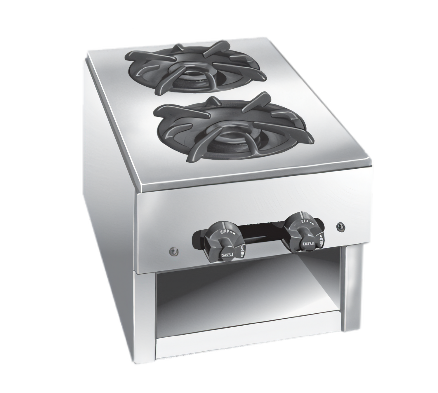 Hotplate, 20" deep frame, countertop, gas, 10" wide, (2) 12,000 BTU burners with cast iron spider grates, stainless steel housing, ¾" rear gas connection, 24,000 BTU, NSF