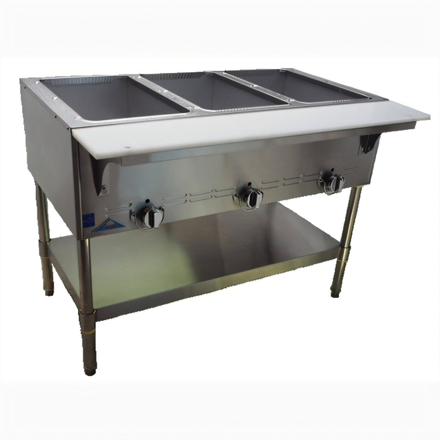 - 44" wide counter with three 12" × 20" dry wells – fits standard steam-table pans