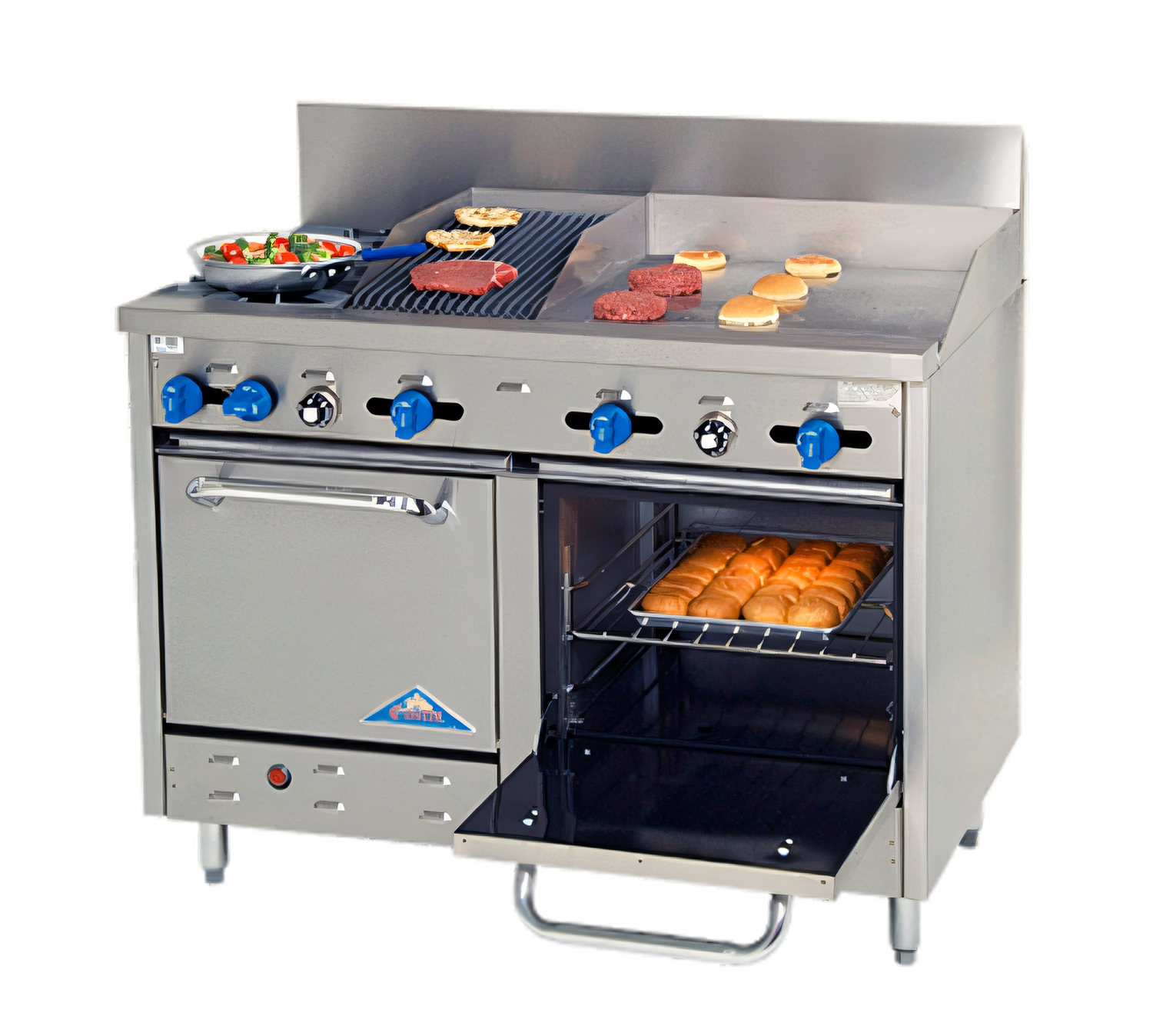 2 Star Burners • 24" Manual Griddle • 12" Radiant Char-Broiler • Double Space-Saver OvensDesigned for high-volume kitchens that need maximum versatility in a minimal footprint, this 48" Comstock-Castle range packs open burners, a griddle, a char-broiler and two independent ovens into one NSF- and cETLus-listed workstation.