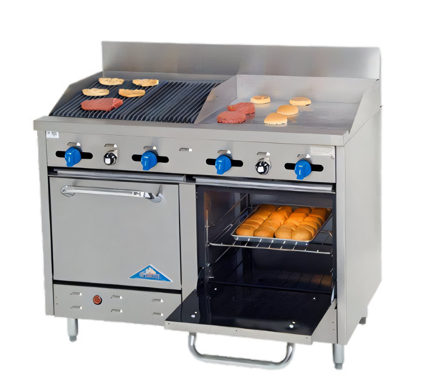 126,000 BTU • NSF & cETLus ListedSear, grill, griddle and bake from one compact 48" footprint. This Comstock-Castle range pairs a 3/4" thick polished griddle and a full 24" iron-radiant char-broiler with two independent space-saver ovens—delivering the power and versatility high-volume kitchens demand.