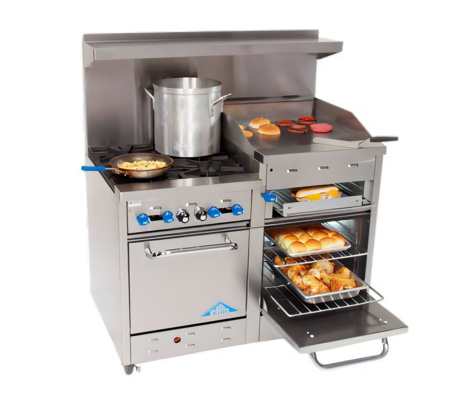 4 Star Burners | 204,000 BTU | NSF & ETL CertifiedPack powerhouse performance into a 48-inch footprint. This Comstock-Castle raised-griddle range delivers high-output open burners, a true 3/4" thick griddle plate and two space-saving ovens—everything you need for sauté, sear, grill and bake service on even the busiest cook line.