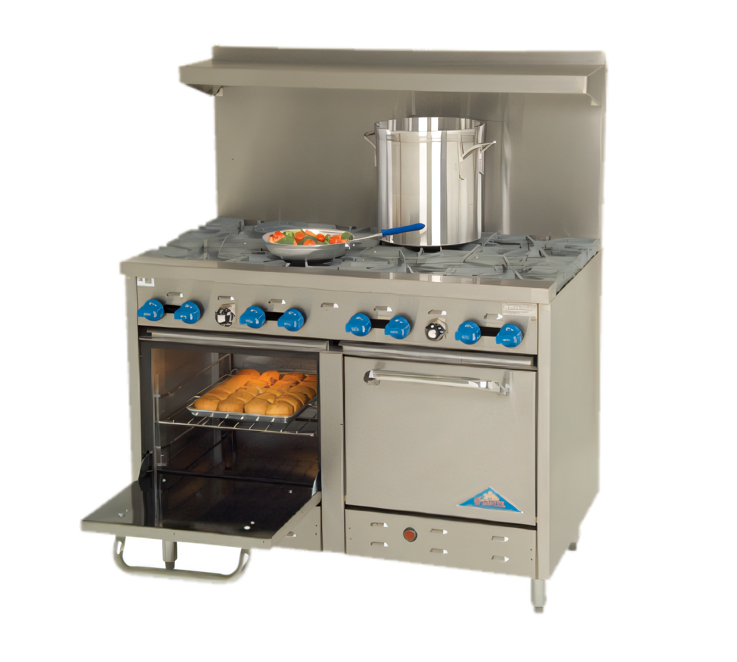 Comstock-Castle • Model: 48-8SB-2SSO • 264,000 BTUHarness 264,000 BTU of precision fire power in a compact, 48-inch footprint. Designed for demanding commercial kitchens, this Comstock-Castle range teams eight high-performance star burners with two space-saving ovens, all wrapped in an easy-clean stainless steel chassis that’s built to last a lifetime of service.