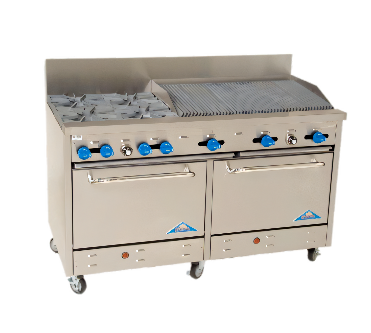 Comstock-Castle 60" Gas Range with 4 Open Burners, 36" Char-Broiler & Double Ovens — 258,000 BTU