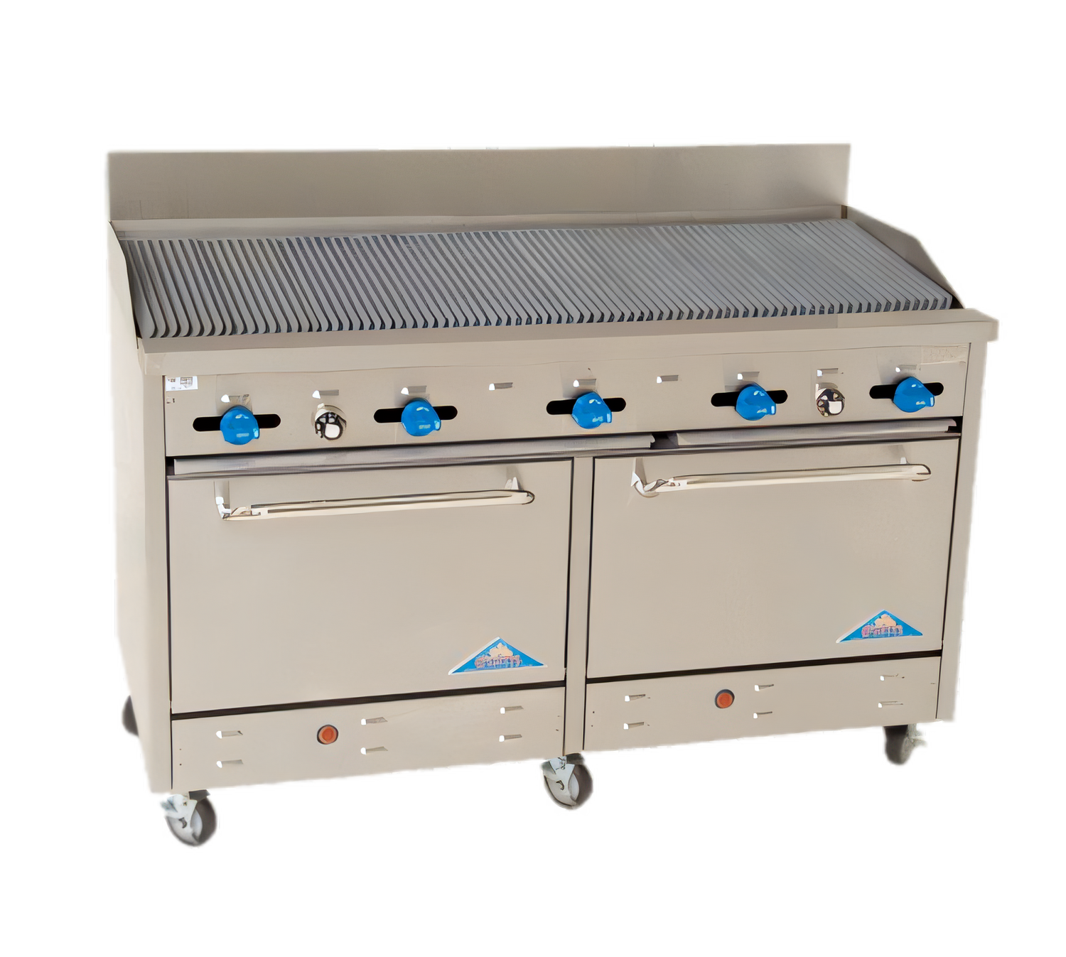 Full-Width 60" Radiant Broiler Top | Two Standard Ovens | 210,000 BTUBring the heat and save the floor space. This all-in-one range marries a 60-inch, heavy-duty char-broiler with a pair of full-size ovens—all wrapped in rugged stainless steel—so you can sear, grill, roast and bake from the same footprint.