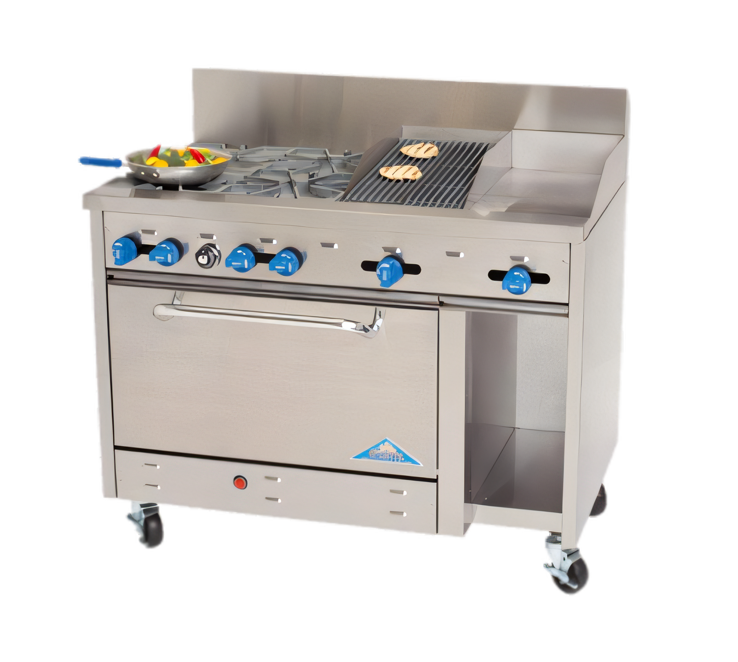 192,000 BTU • NSF & cETLus CertifiedBuilt for demanding commercial kitchens, this 48-inch Comstock-Castle range combines high-output open burners, a precision griddle, a flare-up-reducing char-broiler and a full-size oven—all in one rugged, stainless-steel package.