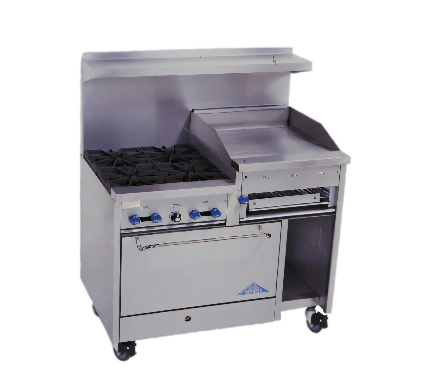 • Rear burners - 30,000 BTU each - 24" x ¾" thick raised griddle/cheesemelter rated at 30,000 BTU with stainless flame spreader for even heat