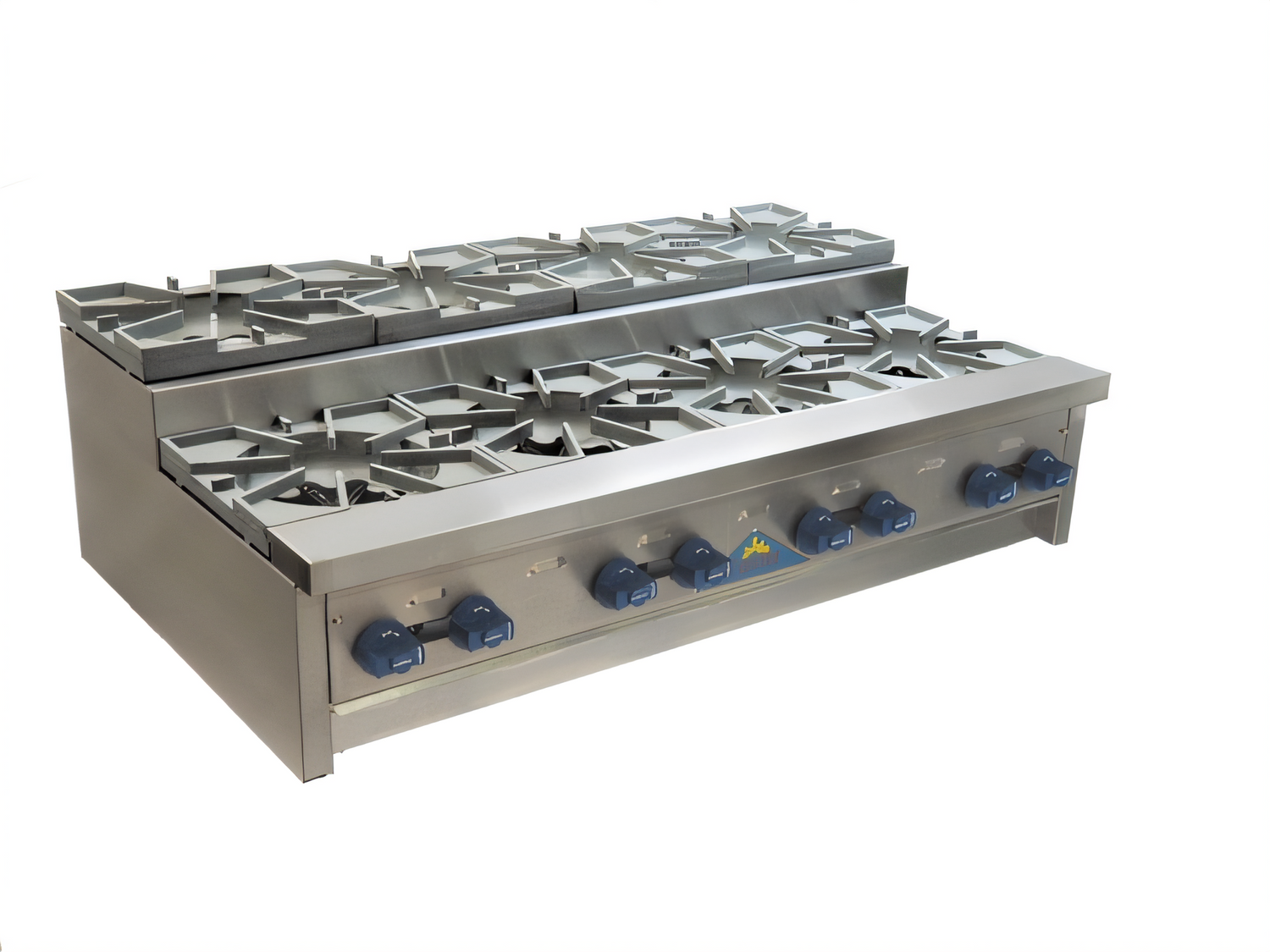 192,000 BTU • 8 Star Pattern Burners • NSF & cETLusBuilt for high-volume sauté, stock and sauce work, the SUFHP48 packs eight powerful open burners into a compact 48-inch footprint. Its step-up design gives cooks two working elevations for easier access to every pot on the line, while rugged cast-iron components and an all-stainless exterior stand up to the daily grind of commercial kitchens.