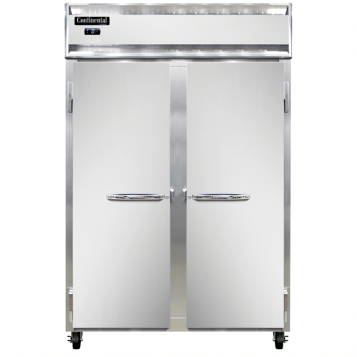 Continental Refrigerator • Stainless steel front / aluminum interior • ENERGY STAR® qualifiedEngineered for demanding commercial kitchens, the Continental Refrigerator 2FN delivers rock-solid -10°F performance, energy-saving R-290 refrigeration and the rugged build quality chefs trust. Two full-height locking doors, generous 48 cu ft of storage and intuitive electronic controls keep high-value ingredients safe, organized and always at the perfect freeze point.