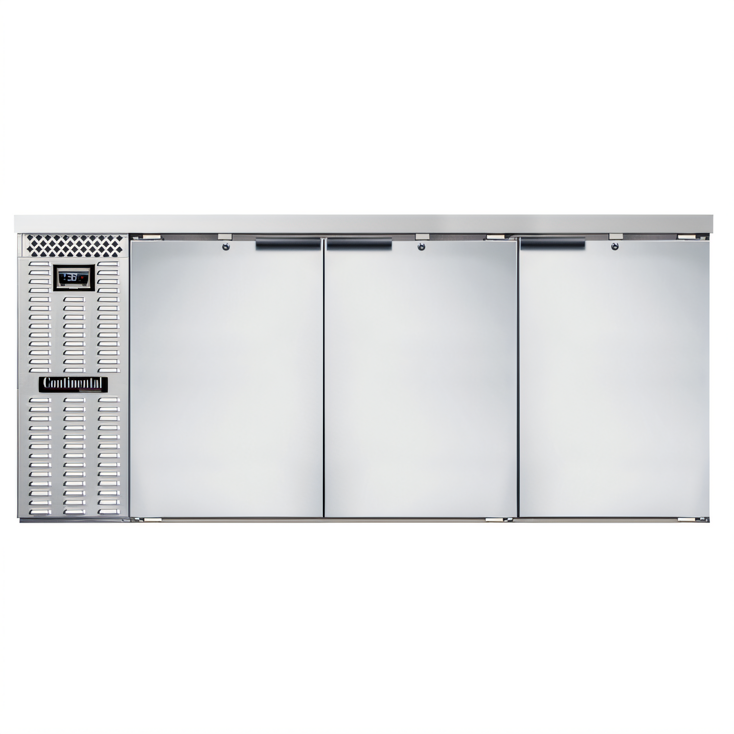 3-Door • 28 cu ft • Stainless Steel • Natural R-290 RefrigerantBring reliable, under-counter cold storage to your bar or tasting room with the Continental Refrigerator BB79NSS. This low-profile, front-breathing back bar cooler packs a generous 28 cu ft of capacity into a sleek, all-stainless-steel cabinet, complete with locking doors and an easy-to-read digital controller.