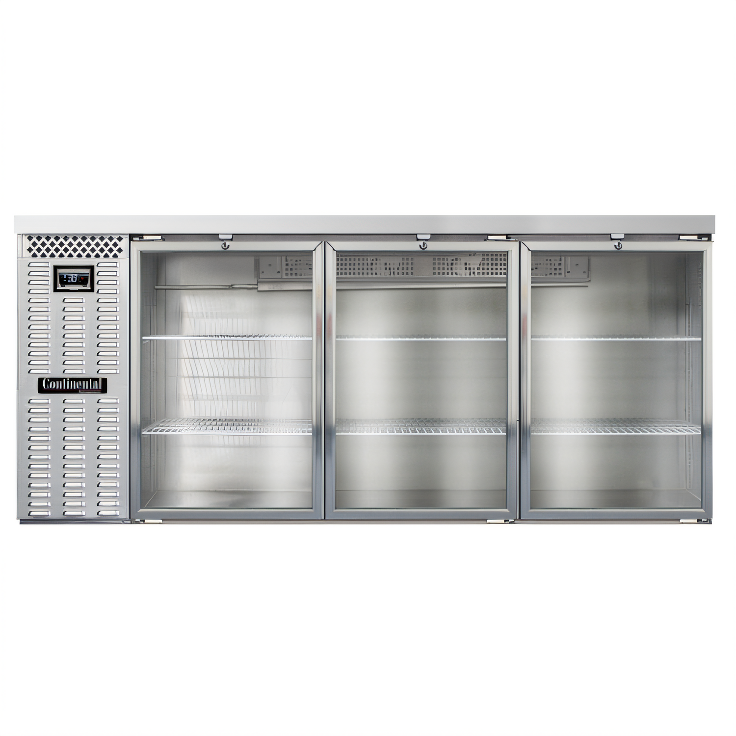 28 cu. ft. | 3 locking glass doors | Front-breathing R-290 systemBuilt for high-volume bars that refuse to compromise on presentation or performance, the Continental Refrigerator BB79NSSGD keeps up to 28 cubic feet of beverages ice-cold and brilliantly merchandised behind three panoramic glass doors—all in a low-profile cabinet that slides easily beneath standard counters.
