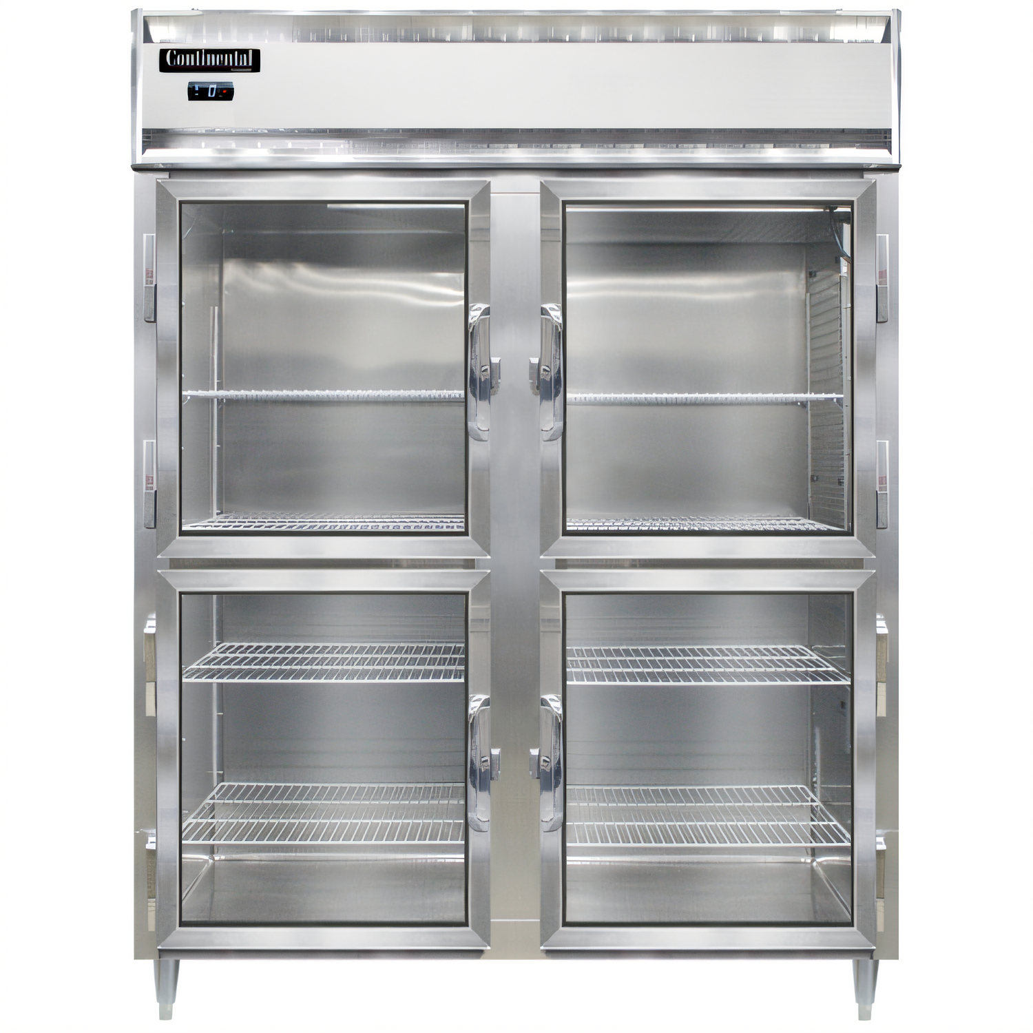 - Four triple-pane tempered glass half-height doors (two per section) provide maximum product visibility while minimizing frost build-up.