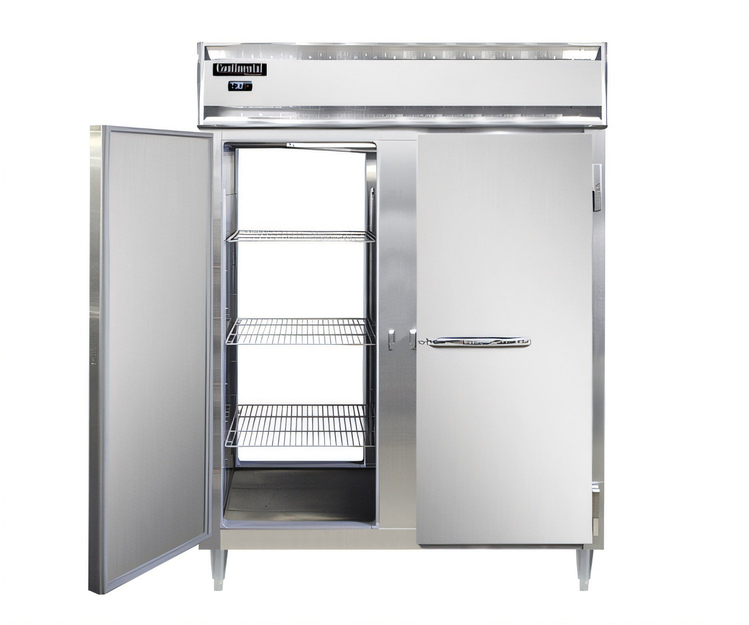 Model D2FENSSPT | Continental RefrigeratorEngineered for high-volume kitchens that demand seamless workflow, this two-section pass-thru freezer lets you load product from one side and pick from the other—keeping lines moving and ingredients at a rock-solid 0 °F (adjustable down to -10 °F). A top-mounted, 1 HP plug-in refrigeration system and 3" foamed-in insulation deliver reliable, energy-smart performance even in 100 °F ambient kitchens.