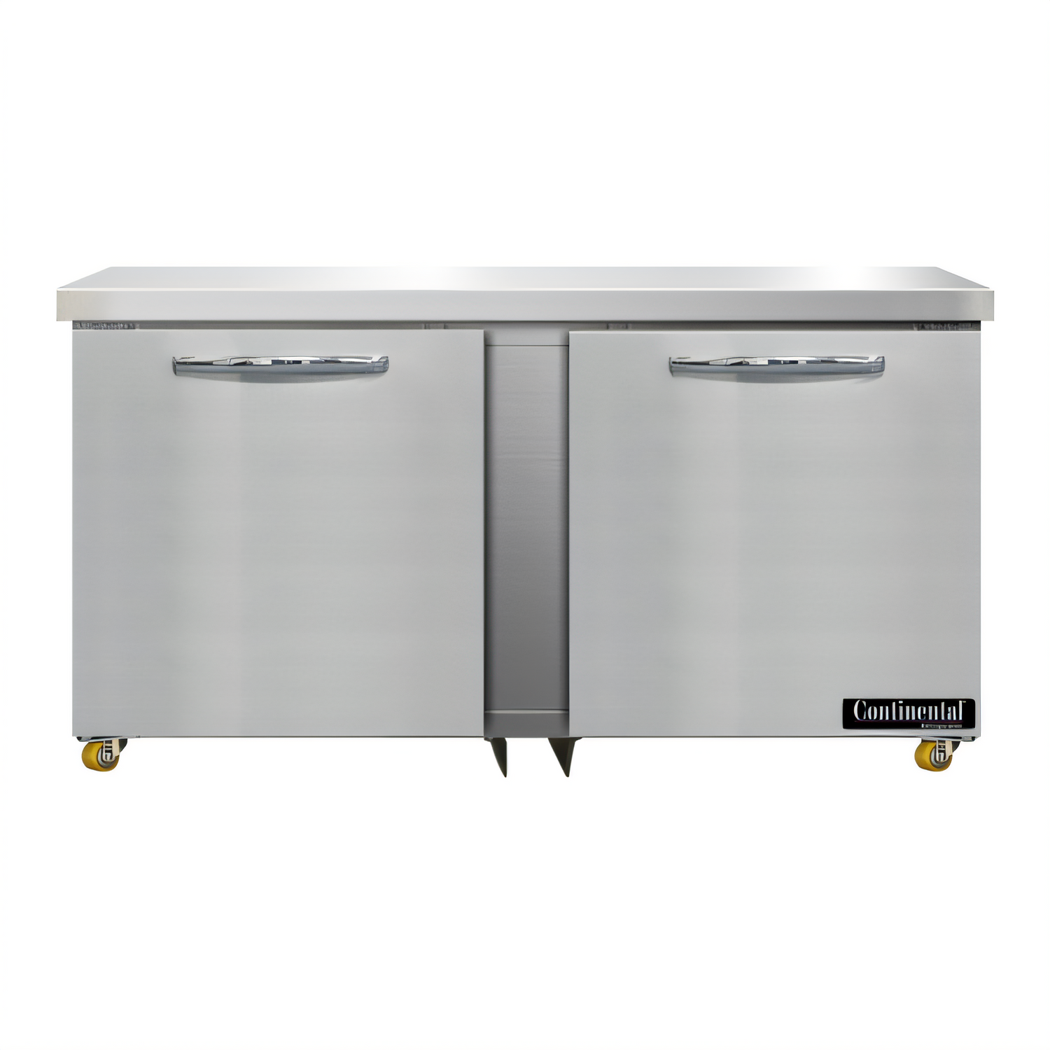 60" W • Two-Section • 0 °F HoldingBuilt for kitchens that demand top-tier performance in a low-profile footprint, the Continental Refrigerator Designer Line DF60N-U slides neatly beneath a 32" counter while delivering rock-solid -18 °C / 0 °F storage. A rugged stainless-steel build, eco-friendly R-290 refrigeration, and an intuitive digital control make this two-door workhorse a smart, sustainable upgrade for any professional workspace.