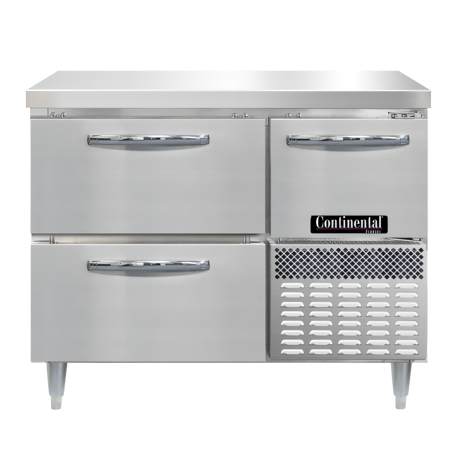 Continental Refrigerator • Model DFA43NSS-DKeep frozen ingredients within arm’s reach while adding a rugged stainless-steel prep surface to your cookline. Continental Refrigerator’s Designer Line 43" Worktop Freezer Base delivers dependable -10 °F to 0 °F storage in a compact, self-contained cabinet built for the daily demands of commercial kitchens.