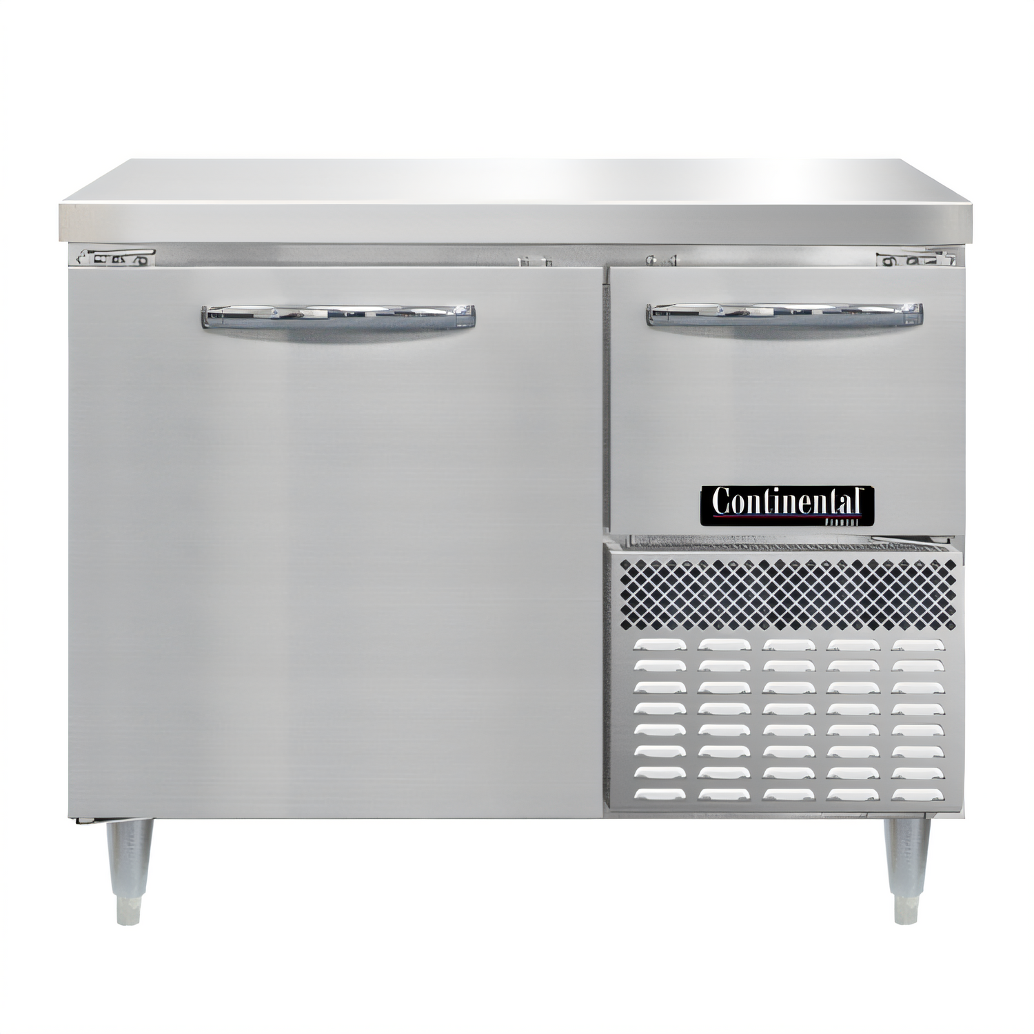 Self-contained base freezer with reinforced stainless steel work surfaceEngineered for demanding commercial kitchens, Continental Refrigerator’s Designer Line worktop freezer delivers high-performance refrigeration, all-stainless construction and the industry’s best 7-year warranty—all in a space-saving 43 inch footprint.