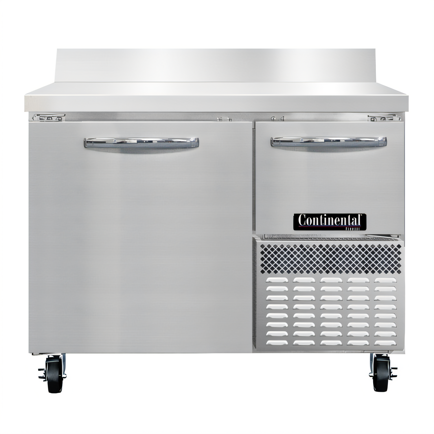 0 °F Base Freezer • Side-Mounted Refrigeration • Made in USAKeep frozen ingredients right where you prep. The Continental Refrigerator FA43NBS pairs a heavy-duty stainless steel work surface with high-performance, R290 refrigeration that holds a rock-solid 0 °F—even in 100 °F kitchens. One full-height and one half-height door give you fast, organized access while the 6" integrated backsplash protects surrounding walls and equipment.