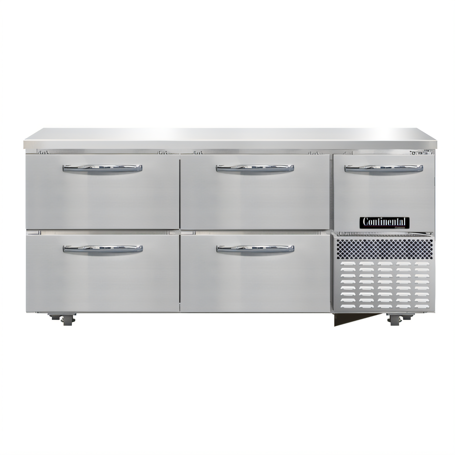 68" W | 0 °F Holding | 4 Drawers + 1 Half Door | R-290Turn the space beneath your cooking line into a high-performance 0 °F freezer. The FA68N-U-D from Continental Refrigerator delivers 22 cu ft of dependable frozen storage in a sleek, front-breathing cabinet that slides easily under equipment stands, charbroilers or ranges. Four heavy-duty drawers keep your most-used ingredients within arm’s reach, while a field-rehingeable half door above the side-mounted compressor handles bulk items. Built, tested and assembled in the USA, this base freezer arrives plug-and-play with a 7-year parts, labor & compressor warranty.