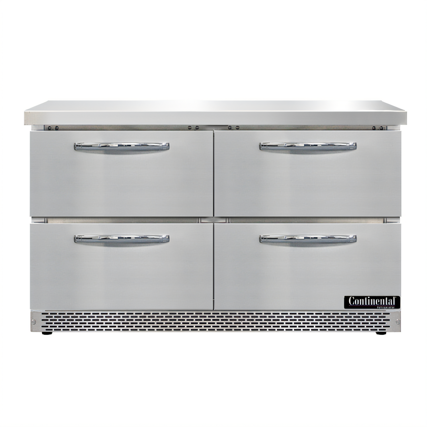 Front-Breathing • 13.4 cu ft • Four-Drawer BaseBring frosty storage right to the prep line. Built to slide flush against walls or into existing casework, the Continental SWF48N-FB-D pairs a heavy-duty stainless work surface with a high-performance, self-contained freezer that keeps ingredients at 0°F—even in the busiest commercial kitchens.