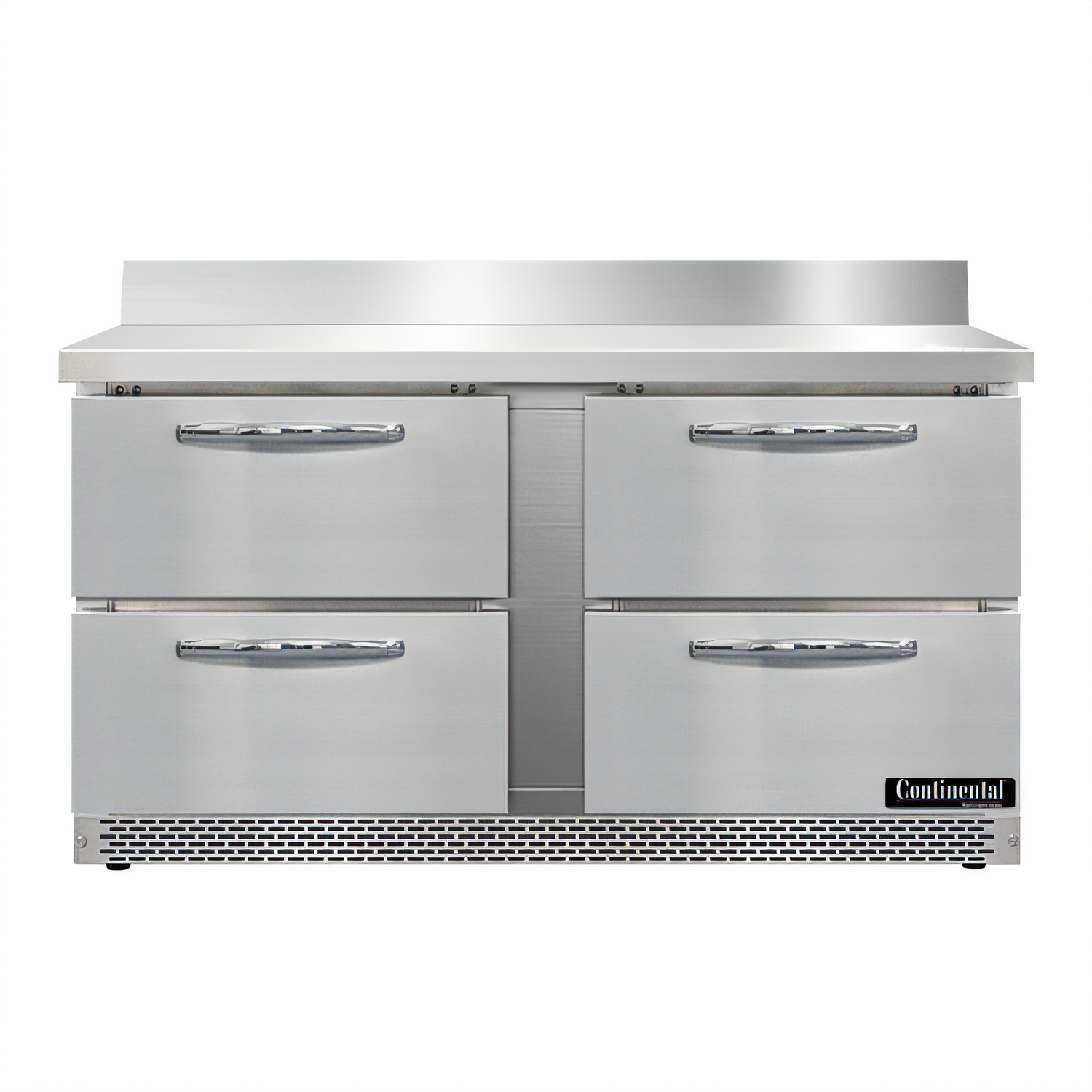 17 cu ft • –0 °F holding • Four-drawer two-sectionBuilt to thrive in the busiest kitchens, this 60" worktop freezer combines a spacious stainless-steel prep surface with dependable –0 °F storage. Continental’s front-breathing ventilation lets you slide the cabinet flush against a wall or build it into a cookline—freeing up valuable floor space without sacrificing performance.