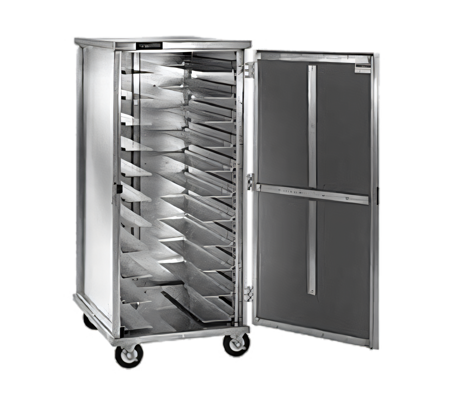 Cabinet, mobile, enclosed, single compartment, non-insulated, hold (11) sets universal angles pan slides on adjustable 1-1/2" centers, reinforced door swings 270°, gravity type latch, card clip included, (4) 5" swivel casters (2) braked, Hi-Tensile aluminum exterior & interior, NSF