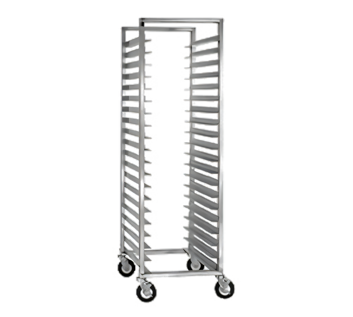 Rack, Mobile Utility, full height, open sides, with angle slides for 15" x 20" pans, slides on 5-1/8" centers, welded extruded aluminum frame, end loading, 24 pan capacity, (4) 5" swivel casters (2) braked, NSF